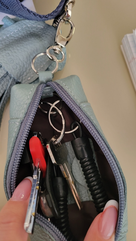 Отличная ключница. Не знаю, почему я так долго не покупала её. Довольно компактная, влезли все ключи, в том числе длинные. Просто прикрепила связку ключей к колечку внутри, пока обхожусь без доп. фурнитуры. Ключи в сумке нахожу вслепую одним движением (что удобно, когда рядом ключи от машины). Пригодился кармашек для домофонной таблетки.