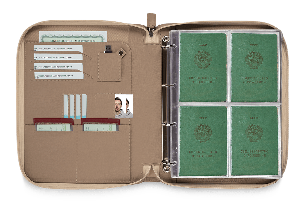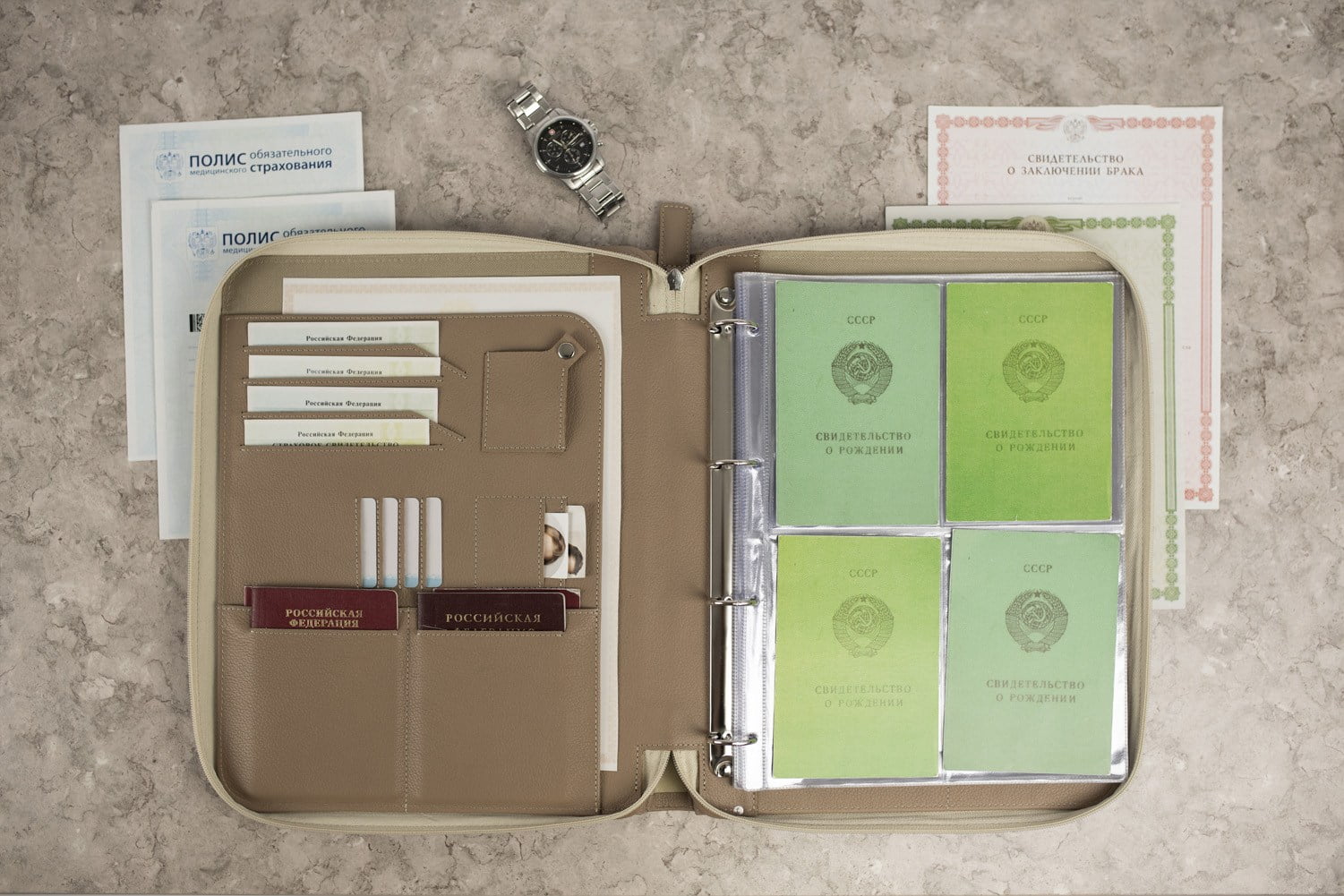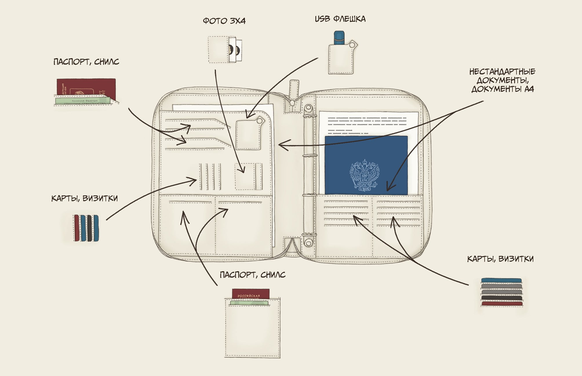- На первом кожаном развороте предусмотрено место для важных вещей и того, что нам нужно чаще всего: паспортов, СНИЛС, пластиковых карт, флешки и фотографий на документы.