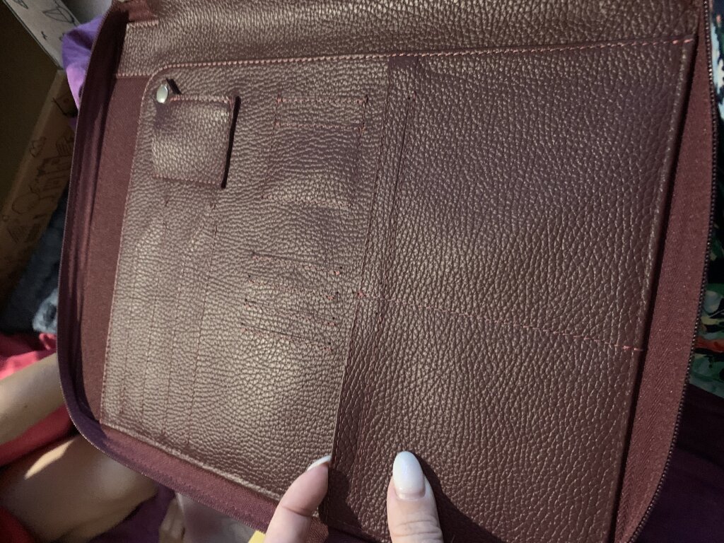 Специально подсчитала — папка мое 17-ое изделие Верфи, считая всё, что я брала для себя, на подарки и получила по акциям. Это первое, что не только не вызвало восторга, но и вызвало лёгкое сожаление и желание вернуть. На 8900 не выглядит точно. Как хороший подарок молодой семье не выглядит тоже. В заднем отсеке для карт торчат нитки от подклада, внутри этих кармашков подклад пришит неравномерно, вообще не понимаю как пришит, карта местами утопает. Заминается внутренний кожаный слой. Заминаются углы вкладышей. Судя по отзывам и ответам, так и задумано. Но почему не сделать чуть побольше папку, если системно стандартные вкладыши не влезают? Создает впечатление, что папка небрежно пошита. Забирала второпях, толком и не рассмотрела, доверив это продавцу. Больше не буду так делать.