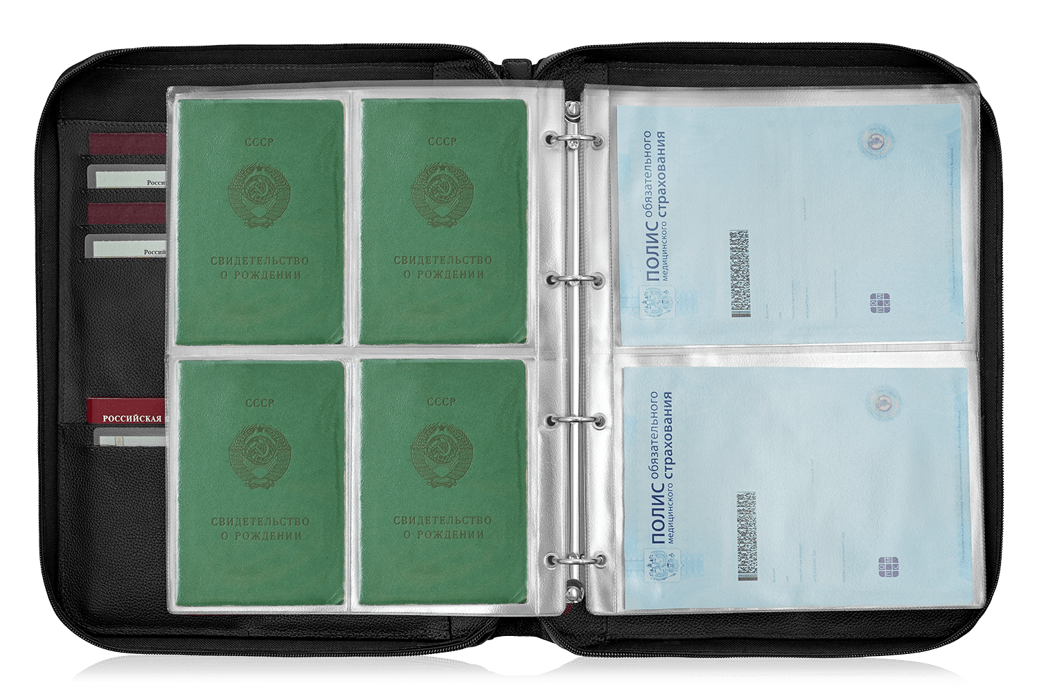 - На первом кожаном развороте предусмотрено место для важных вещей и того, что нам нужно чаще всего: паспортов, СНИЛС, пластиковых карт, флешки и фотографий на документы.