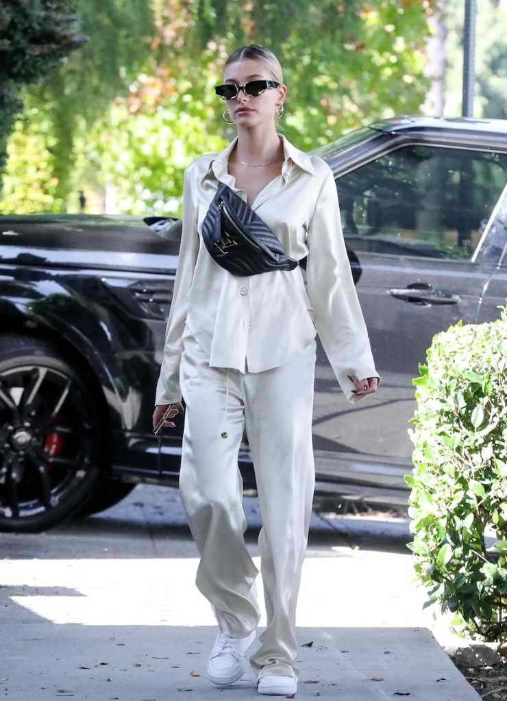 Помимо удобства и актуальности, у поясной сумки есть еще один значительный бонус – вне зависимости от фактуры и цвета, ее можно смело назвать демисезонной. Поясная сумка отлично сочетается как с объёмным свитером и пуховиком, так и с шёлковым костюмом и кроссовками – как это сделала Хайли.