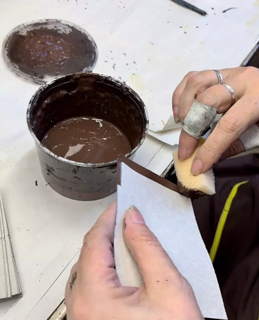 Тут тоже много вариантов. Мы наносим санкционные итальянские краски, потому что у них классная укрывистость и адгезия (как краска приклеивается к коже). Ещё есть вариант нанесения полимера (всё те же многострадальные «Смарт» и уголок ремешка «Шелл»). Он наносится, когда нужен очень толстый слой краски, который будет выглядеть монолитно и гладко. Если просто наносить краску, то сохранится структура кожи.
