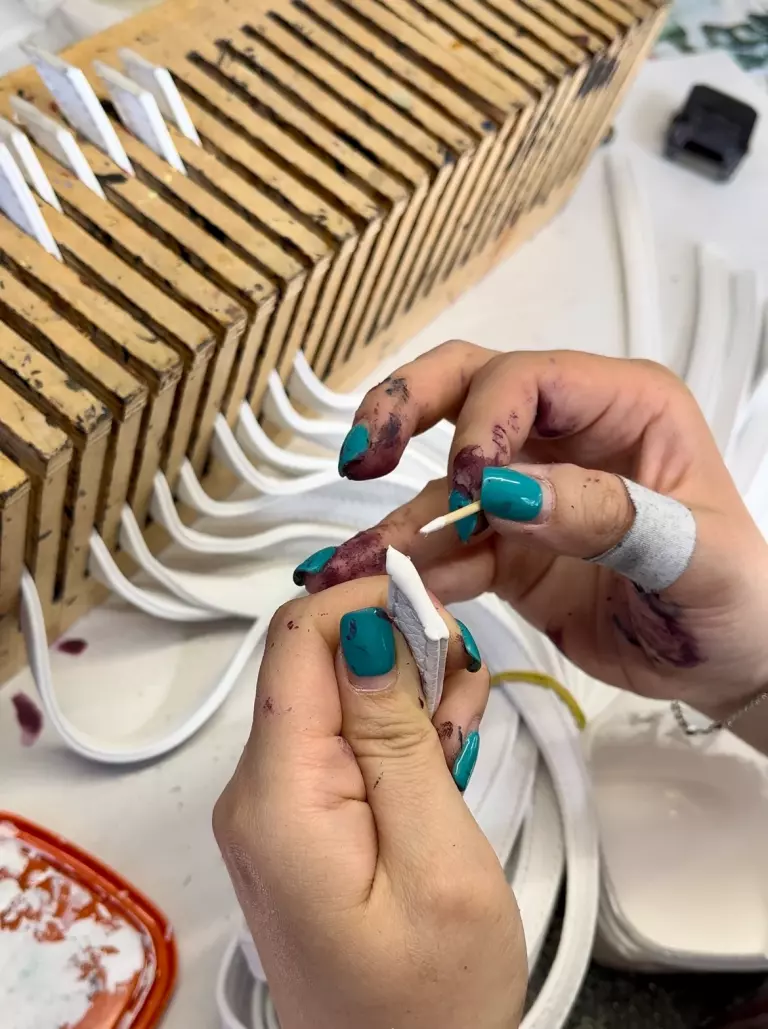 Работа эта очень тонкая и кропотливая: чего только стоит нанесение полимера зубочисткой на ремешок «Шелл». Инновации инновациями, а сумки пока ещё собираются руками.