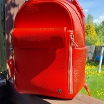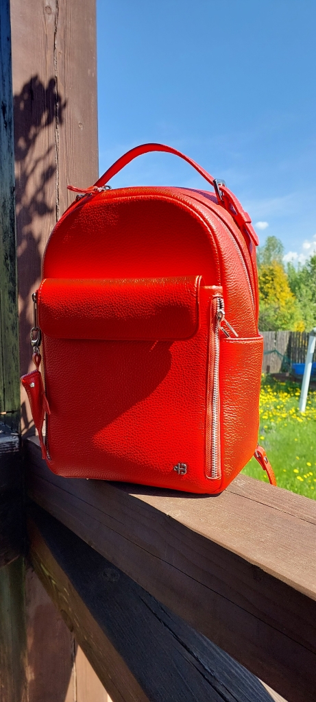 Мой красно-оранжевый красавчик радует глаз и поднимает настроение в любую погоду. На солнце рюкзак имеет оранжевый подтон,а в тени красивый алый оттенок. Цвет оказался удивительно универсальный, легко сочетается с одеждой . Большое яркое пятно привлекает внимание и создаёт настроение даже самому простому образу из футболки и джинс.