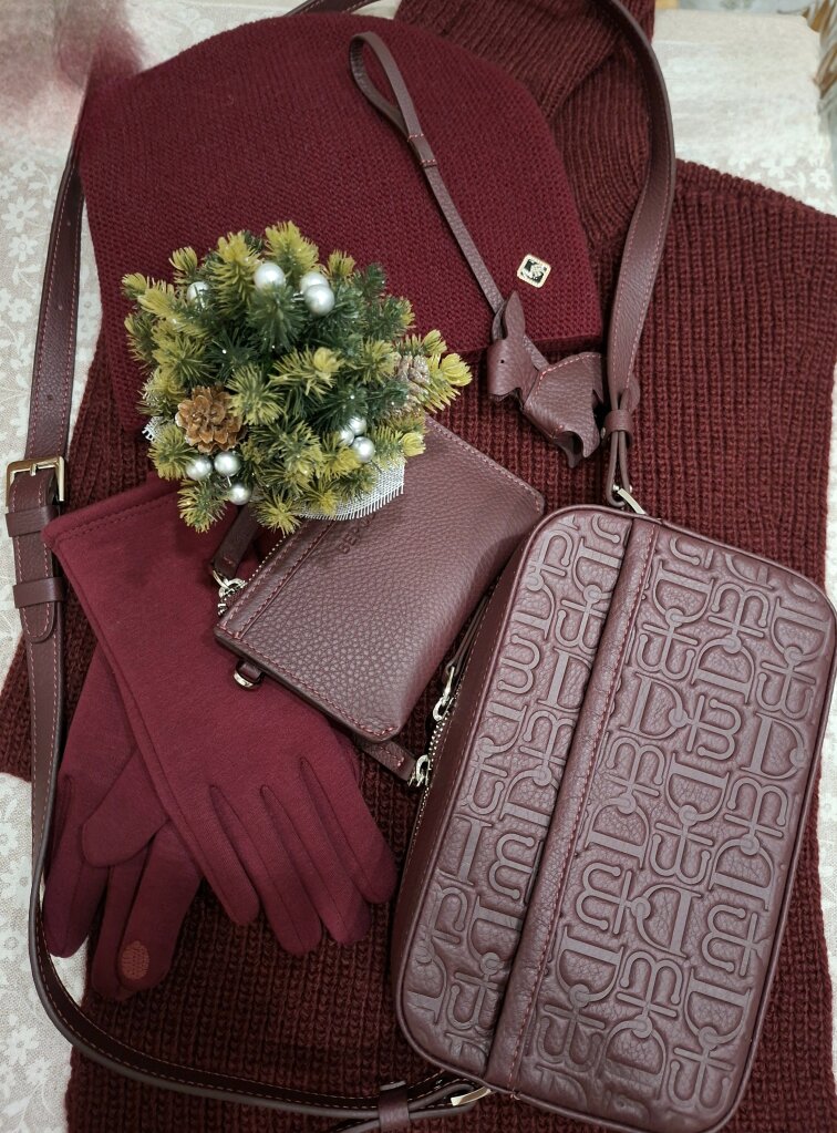 Получила сумочку, а с ней и зайчика, и новый кошелек. Все замечательно! Сегодня обновила сумку. Очень удобная, да что говорить: это та самая базовая сумка, которая подойдет к любому образу! Зайчик длинноват, но ничего, я его приспособлю, без него никак нельзя было обойтись. Меня не миновало винное безумие, поэтому к сумочке заранее были куплены: шапка, манишка и перчатки, фото прилагаю. Оттенки все разные, так интереснее. Цвет сумки великолепен!