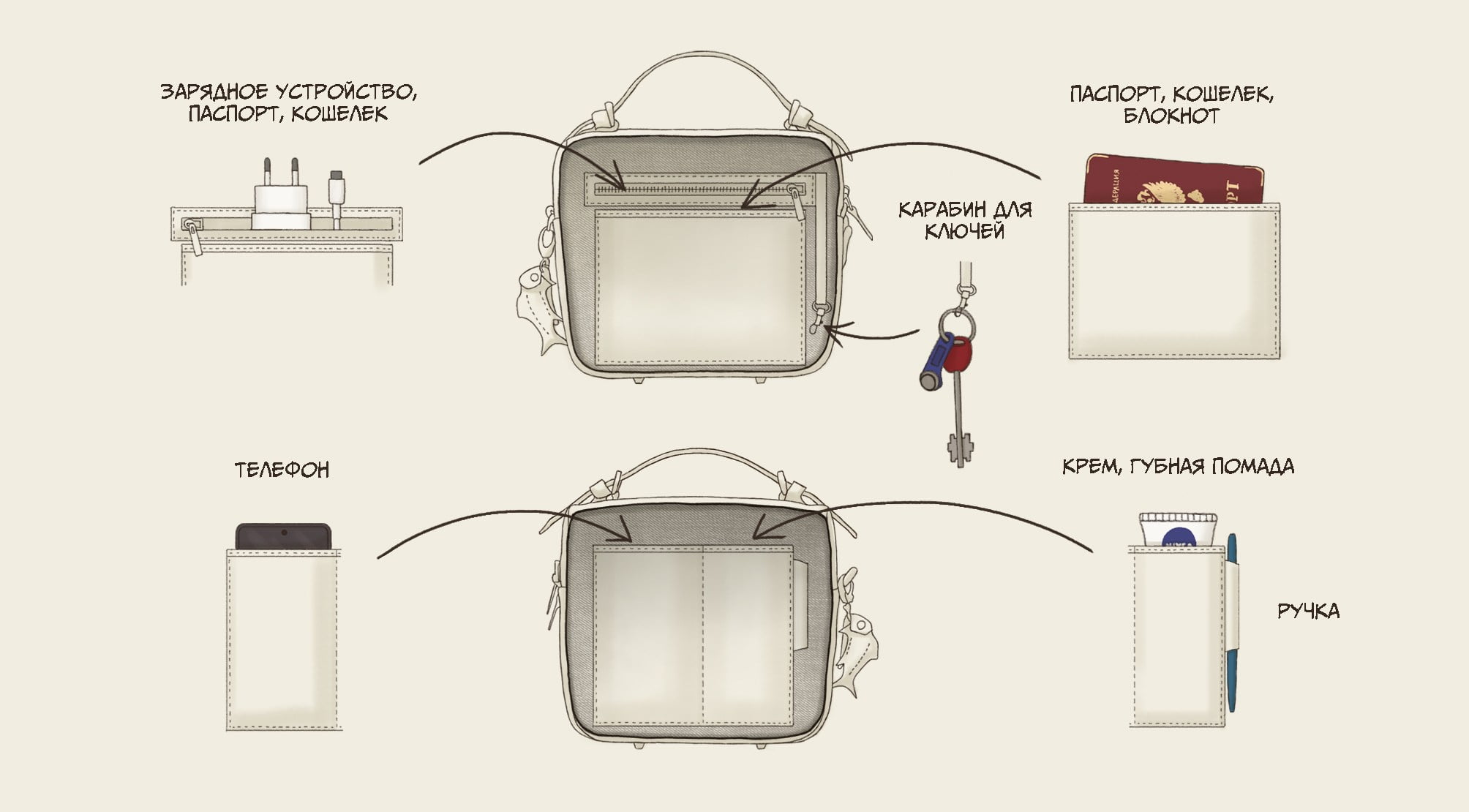 Не могу удержаться и не написать: очень долго не могла начать носить маленькие сумки — после рюкзаков места и функционала вечно не хватало. А тут спонтанно взяла и она оказалась божественной! Так много кармашков и все такие логичные и удобные. И дизайн аккуратный, ничего лишнего. Я прямо благодарна за эту сумочку