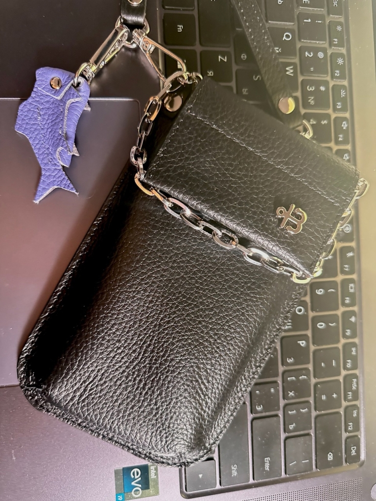 Обожаю свой черный Флиппер! Это самая красивая сумочка у Верфи. Цепочка в цвет значка Верфи, контрастирует с черным и ярко выделяется, а при желании ее можно закинуть в другую сторону, и сумочка будет смотреться по-другому. Узкая черная кисточка отлично дополняет сумку. Обвесов, больше обвесов — подумала я и заказала еще пиранью в цвете Very Peri. По функционалу ничего лишнего: входит телефон и снаружи есть кармашек для карточки. Флиппер напоминает мне хипповский продвинутый ксивник, очень милый и стильный.