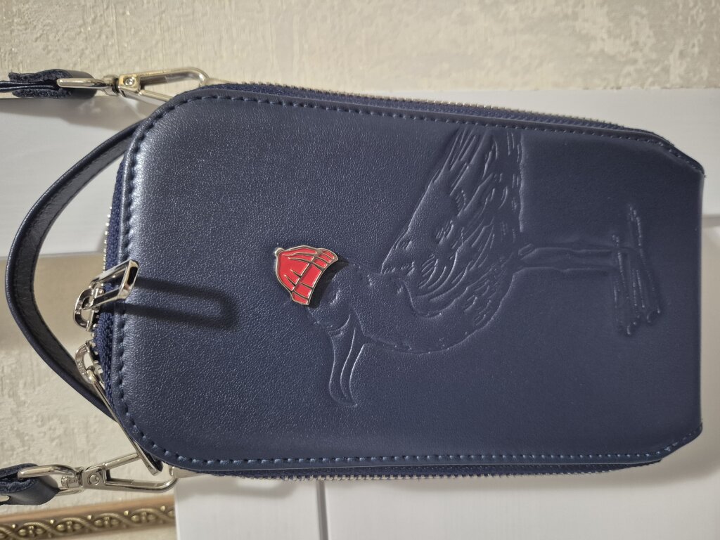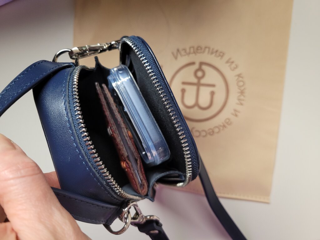 Искала сумку для телефонов. Когда в интернете увидела синюю сумку с замечательной чайкой в красной шапочке — выбор был сделан сразу!😊 Единственное, за что я переживала — поместятся ли в ней два больших телефона. Результат превзошёл все мои ожидания! В эту маленькую сумочку поместились не только два больших телефона в чехлах, но и документы на машину или паспорт.