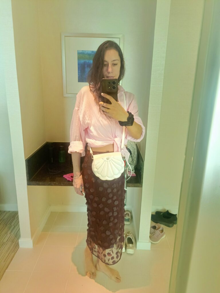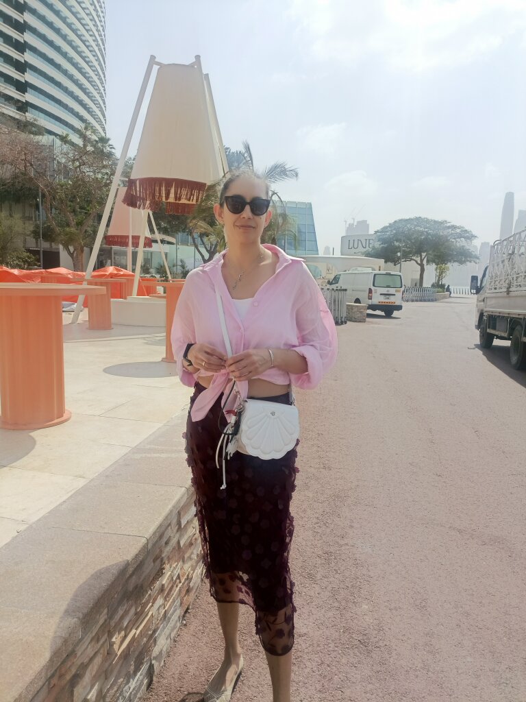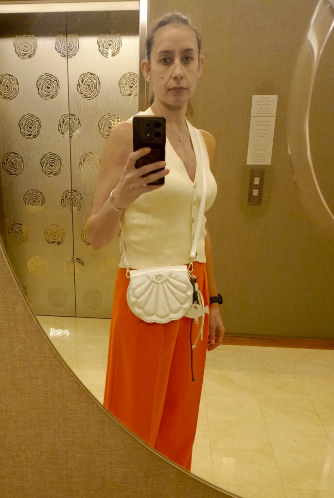Ракушка впечатлила с самого начала, подумав,решила что мне не надо, НО она же мне покоя не давала и спустя полгода мне очень надо!!! В итоге занесла в календарь в ближайшую дату и вот сейчас 18 февраля она вместе со мной в Эмиратах гуляет, морским воздухом дышит, на солнышке греется. Очень летняя сумочка, небольшая, только для важных мелочей, впихнуть невпихуемое не получится. Но зато как она круто в образах смотрится. Довольна и даже очень. У меня теперь есть и маленькая и большая ракушки.