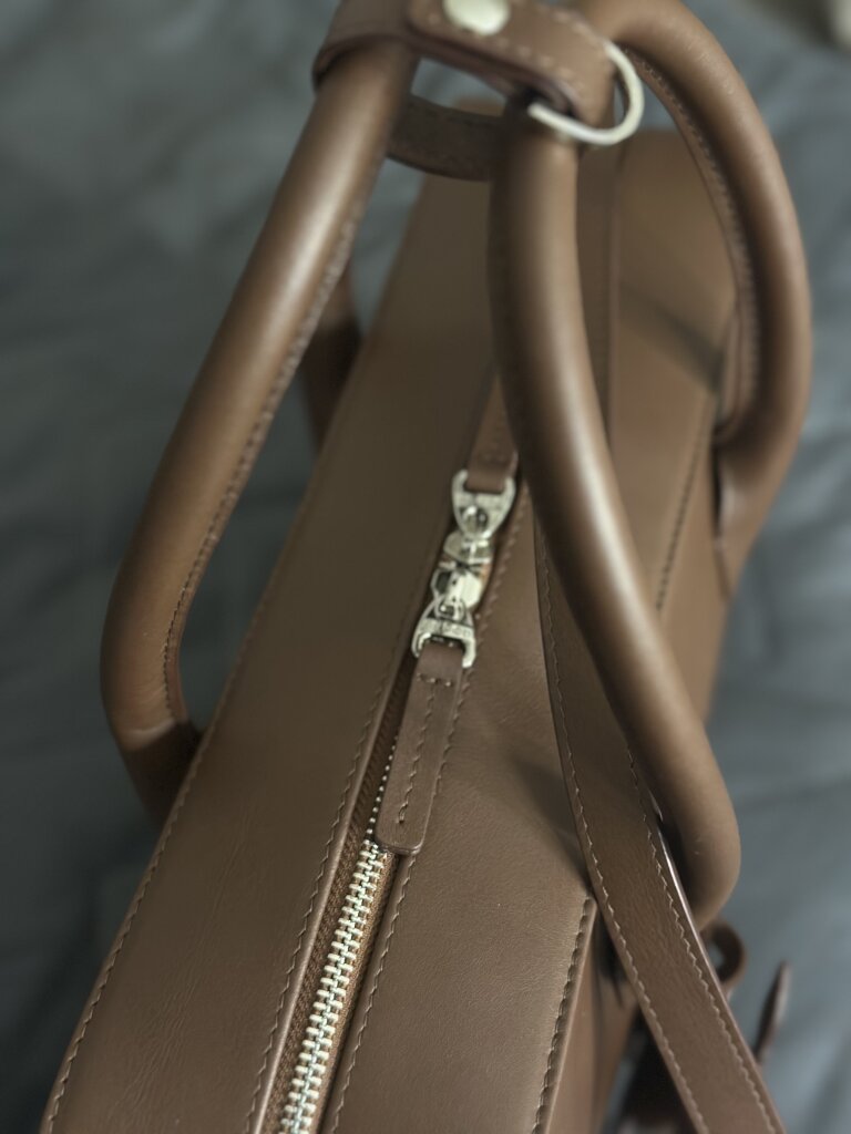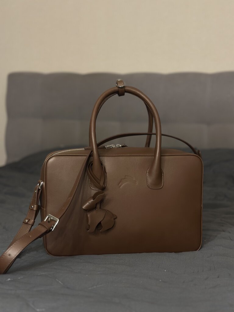 Отличная функциональная и при этом красивая сумка! Влюбилась в нее не с первого взгляда, но в реальности превзошла все ожидания, и по визуалу, и по функционалу. На фото выглядит больше. Вместимость отличная, зонт, бумаги, контейнеры с едой, вся мелочь, которая обычно носится в сумке, легко вмещается. Классный непередаваемый на фото оттенок коричневого, выглядит в самом хорошем смысле дорого и универсально. Кожа тактильно приятная. Знаю, что предназначена в первую очередь для ношения в руках, но мне также удобно носить на плече