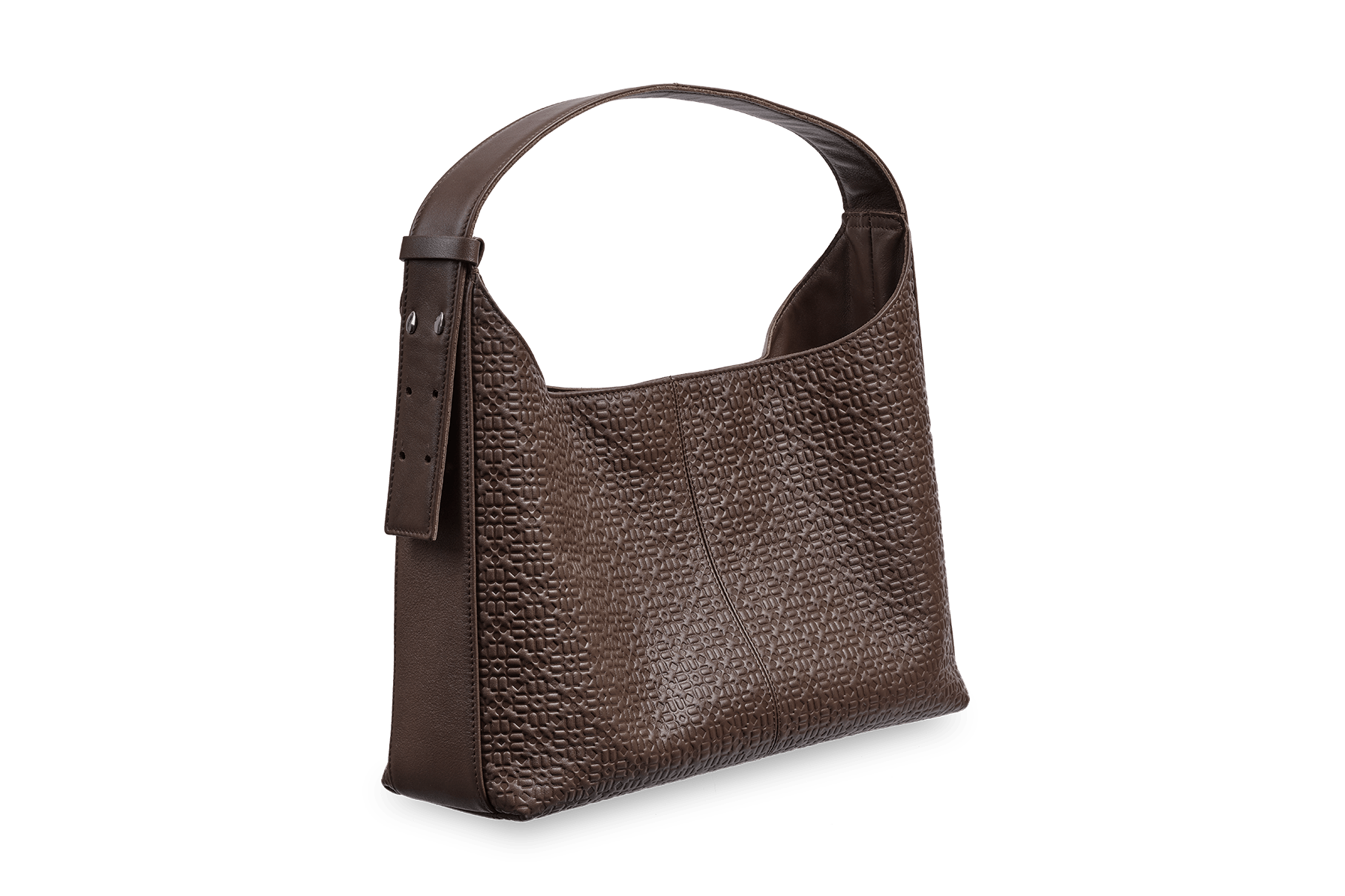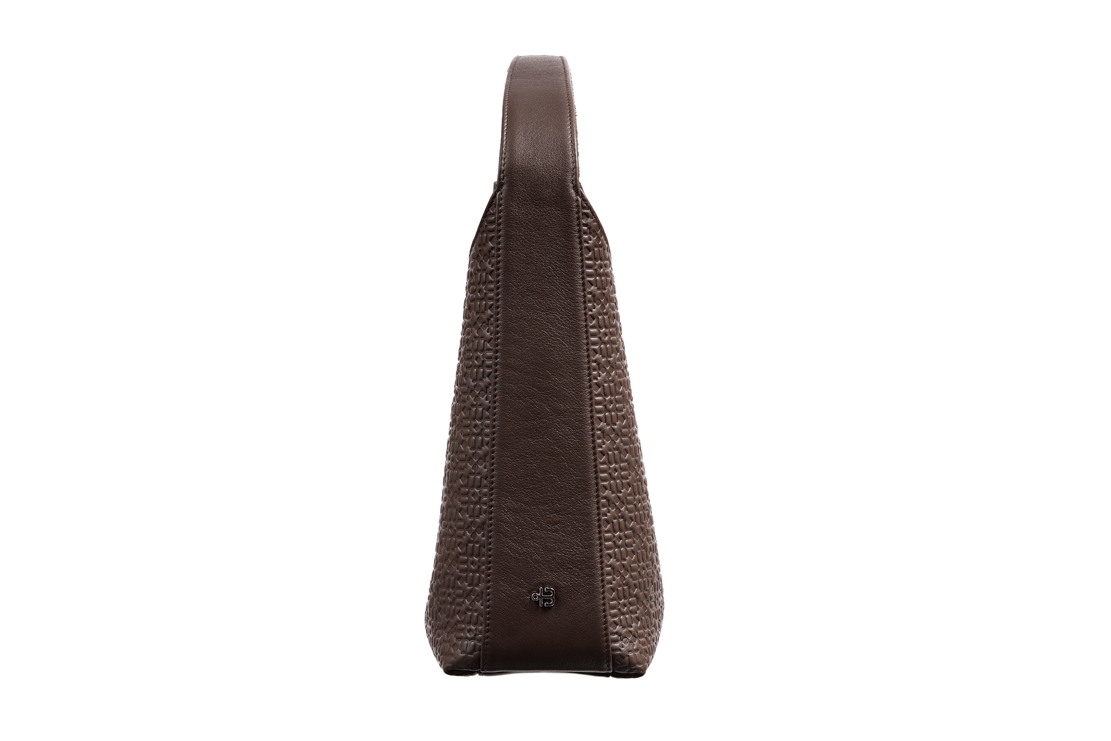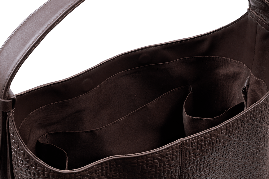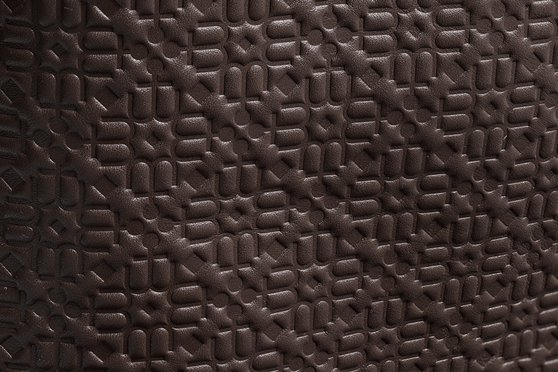 Гладкая кожа покрыта тиснёным паттерном: мягкий геометричный ритм, в который вплетены узнаваемые элементы логотипа. Рисунок живёт на свету — то проявляется чётко, то уходит в тень, оставляя только тактильный след под пальцами. Эту кожу хочется рассматривать вблизи, водить по ней подушечками, ловить графику.