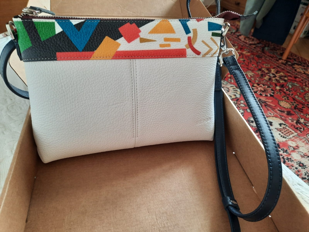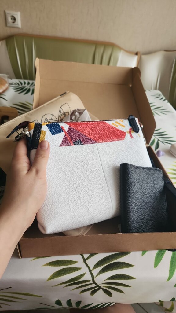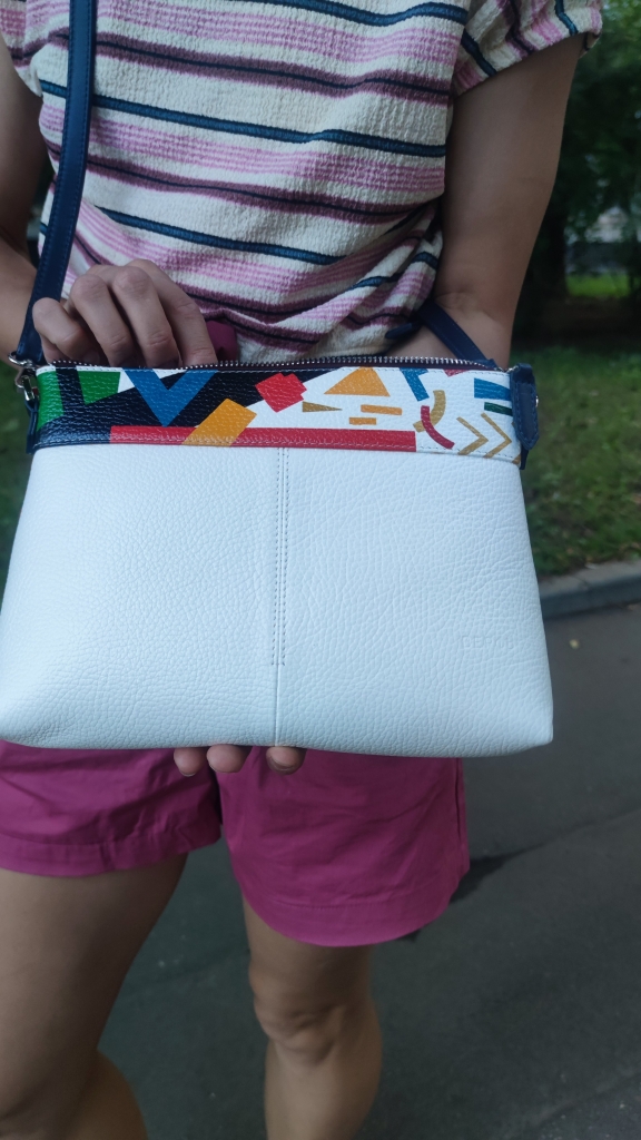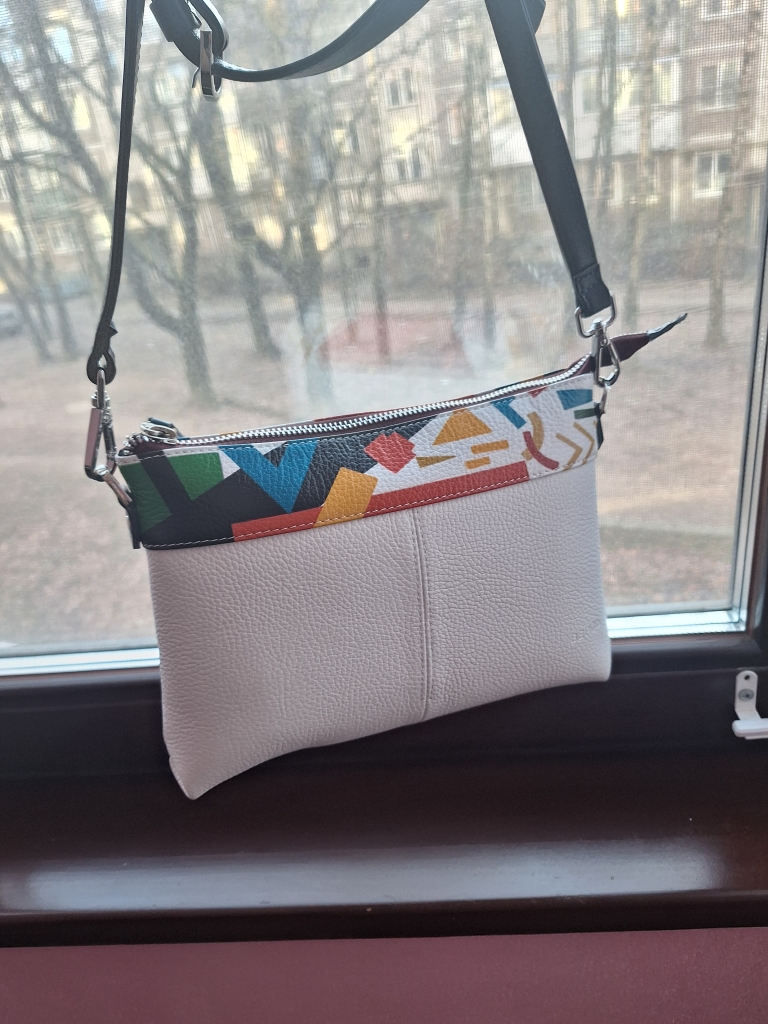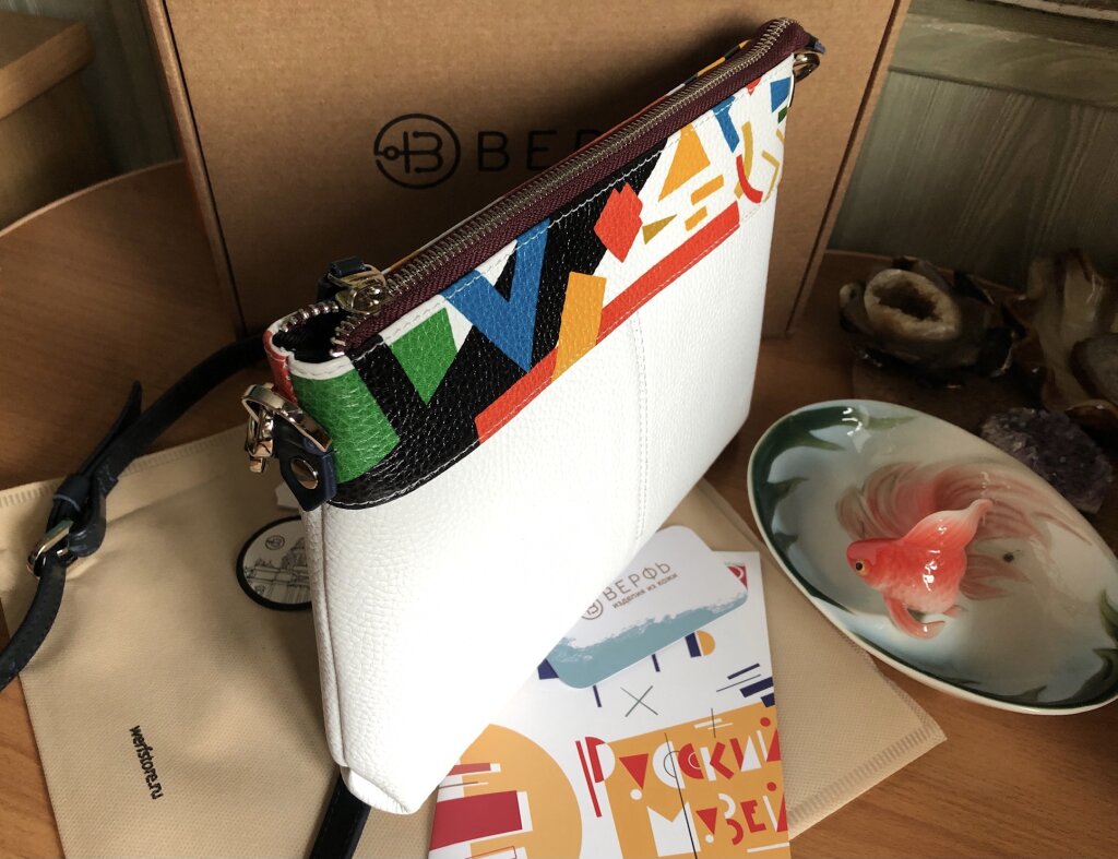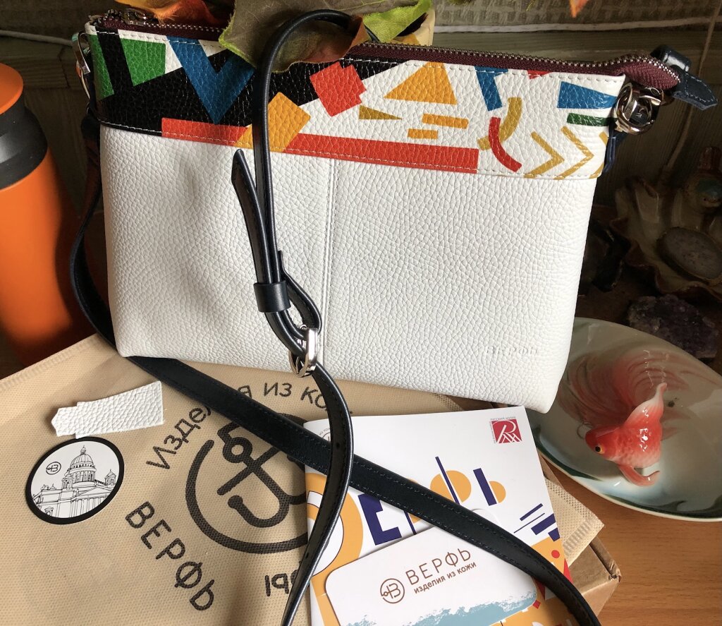 Долго искала летнюю сумочку белого цвета именно из натуральной кожи. Когда увидела Breeze Malevich, поняла, что вот она, та самая)) В основе белая, а верх многоцветный, значит подойдет к разным нарядам. Достаточный размер, внутри два кармана, что удобно. С ровными строчками. А еще порадовало, что сумочка отечественного дизайна. В общем, очень довольна покупкой. В магазине в Москве доброжелательная девушка-продавец хорошо упаковала сумку в тканевый чехол и коробочку. Теперь буду мечтать о большой сумке, в которую поместится все и больше. Спасибо создателям Верфи, в полку верфанутых прибыло))