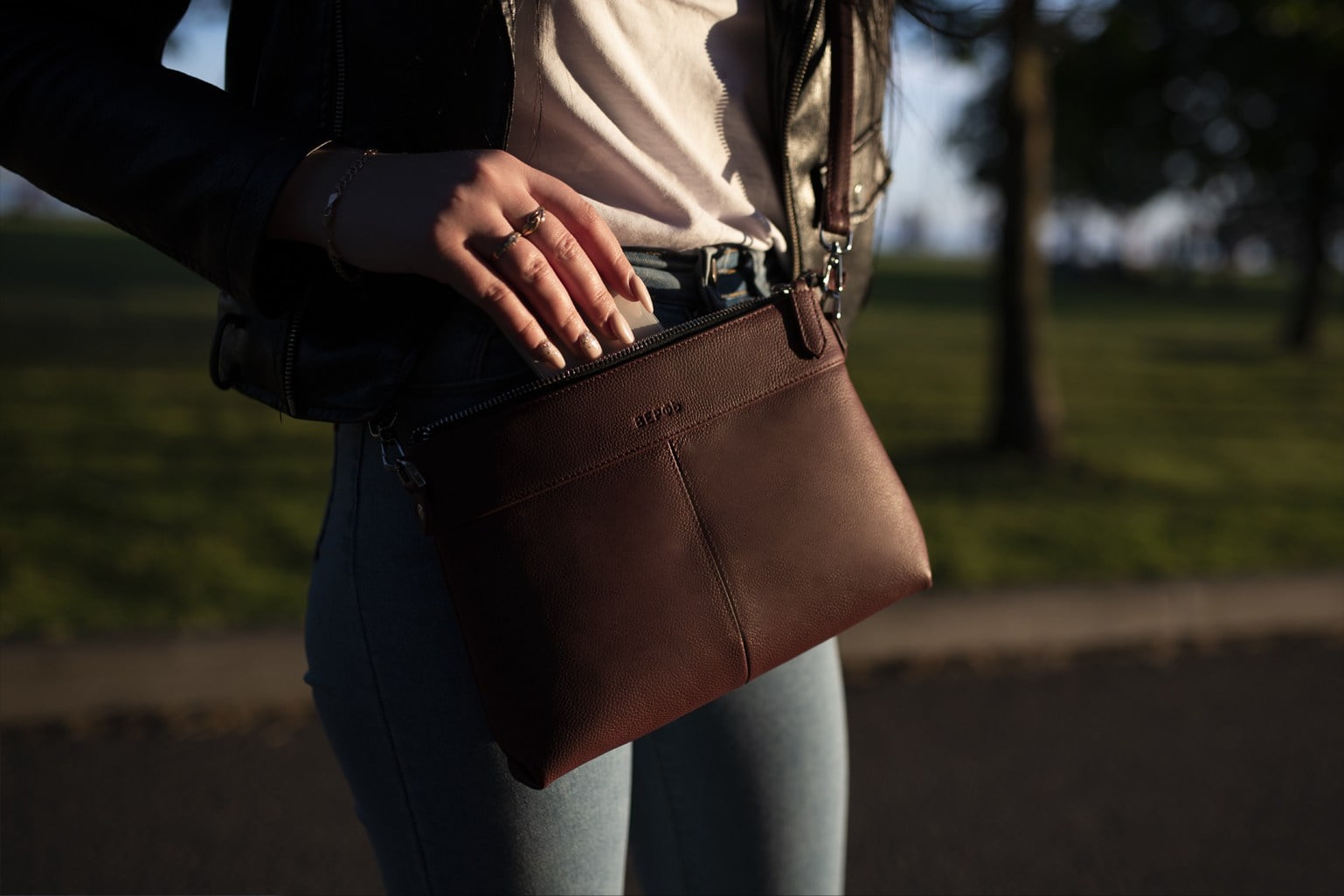 Лагуна — это вместительная сумка из натуральной кожи, внутри которой мы расположили клатч. К основной сумке он крепится с помощью двух ремешков на кнопках и используется как органайзер. В то же время кожаный клатч можно открепить, добавить к нему плечевой ремень и носить как самостоятельный аксессуар.