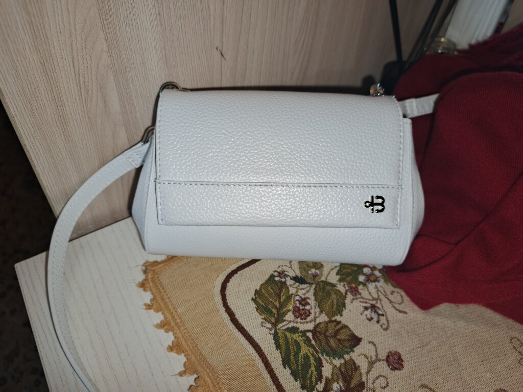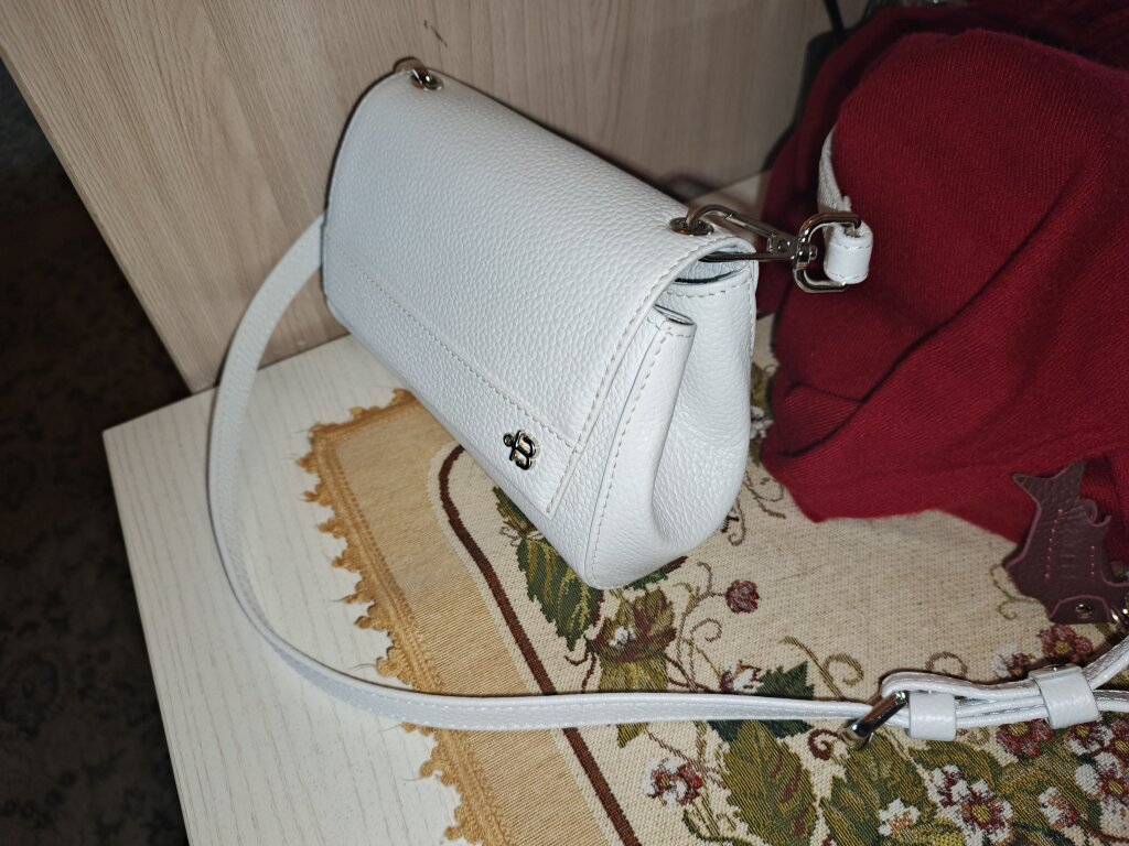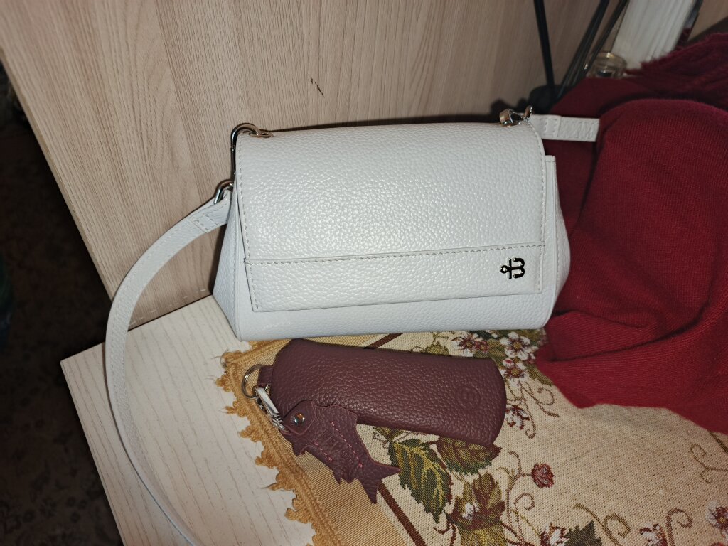 Эта сумочка не просто маленькая, а супер маленькая. Оставила, очень понравилась фактура кожи, не гладкая, а с зерном. Цвет холодный белый, без ухода в беж. Что бы не много было больше места, я вытинула бока. Не очень удобно открывать, содержимое может просто вывалиться. Ну она такая миленькая, что не смогла отказаться. Всей команде, спасибо!