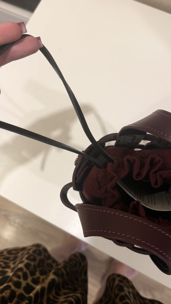 Сама сумка отличного качества, красивый цвет, но: 1. Вся перекошенная, я не понимаю, как сделать, чтобы она была ровная, потому что меня такое не устраивает за эту цену . 2. Как вам уже писали в комментариях вы не завязываете узелки. Если честно, я надеялась, что вы это учтете, но видимо нет. Покупкой не удовлетворена, хотя ждала ее безумно