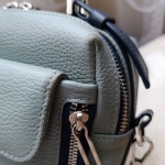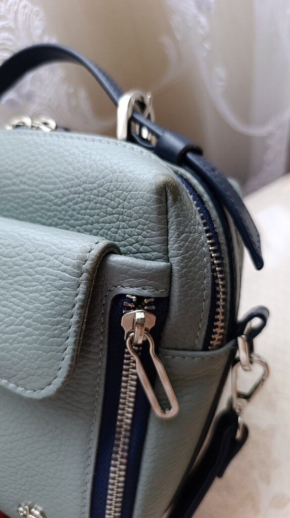 Получила сегодня свою серо-голубую сумочку, очень довольна. Легкая, хорошо держит форму, идеального для меня размера на лето. В одном из отзывов к рюкзакам прочитала негатив про фурнитуру, сразу проверила у сумочки: все отлично. Молнии хорошие, не царапают, бегунки тоже создают впечатление качественных. Ремешок идеально подобран по цвету и тону.