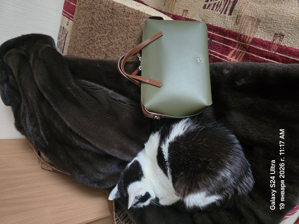 Прошло 2 недели с получения сумки, самое воемя оставить отзыв. Долго думала, нужна ли мне такая сумка. Смущала, что не монохром. Потом решилась, и сразу скажу — полный восторг)))) Выбрала вариант мини, так покупала к шубе и именно короткие ручки быои главным требованием, что бы не было искушения носить на локте. Первые ощущения от сумки — тактильные, матовая и слегка шершавая кожа — очень необычно. Второе, что меня удивило, что сумка в реале компактней, чем выглядит на всех фото (сразу скажу, что в описании указаны размеры, но делать выкладки с линейкой мне было недосуг)))), на фрто она смотрится более объемной, но даже это несоответствие не является недостатком. По внутренностям сумки: огромное спасибо дизайнерам, которые это очень функционально, в нее можно вместить много мелочей (наличие кармашков очень продумано, что отличает все сумки Верфи, с которыми я столкнулась). Пока не носила с наплечным ремнем, думала вначале, что он мне не пригодится: сумка предполагалась зимней, но теперь точно знаю, что это будет круглогодичный вариант. Прилагаю фото, олива с коричней отделкой замечательно гармонирует с коричневой шубой, на фото попала кошка, поскольку ей сумочка тоде пришлась по душе)))
