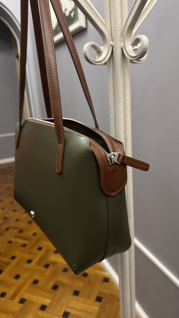 Сумка Валония оливковая (М) для меня оказалась не настолько вместительной, как я ожидала. Мой необходимый набор для работы в ней еле умещается. Но о покупке не жалею. Есть в этой сумке что-то притягательное. Такой уютный, приятный оригинальный вкладыш. Сочетание зелёного и коричневого радует глаз. К тому же, мне удобно носить её на плече.