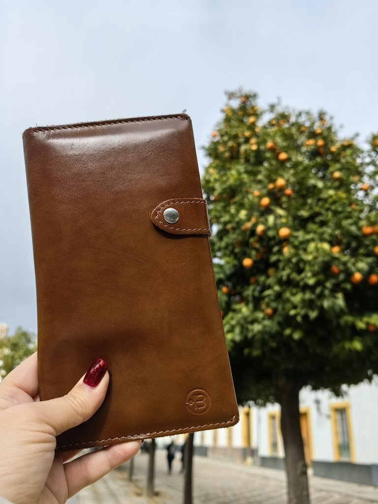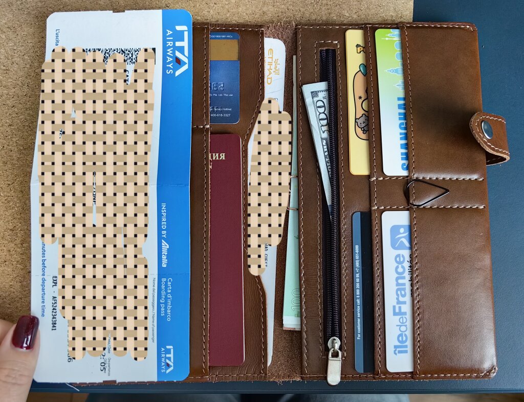 Slap Brown со мной с декабря 2024, посетил 12 стран, ~ 50 раз открывался и закрывался в аэропортах и вокзалах, на сгибе появляются крошечные морщинки, но это совсем не отдушка, и вообще, помним про загар наппы. Стандартный посадочный в карман не помещается — надо либо сунуть его сложенным вдвое, либо просто вложить в закрытый кошелек. Укороченные посадочные (как у Etihad) помещаются. В карман на молнии банкноты 100 евро не помещаются (в карман за ним влезет, а для спокойствия можно прицепить канцелярской нано-прищепкой), остальные — ок. Паспорт в свой карман помещается, а также в кошелек можно засунуть мелочи типа марок.