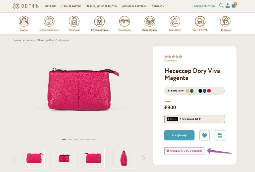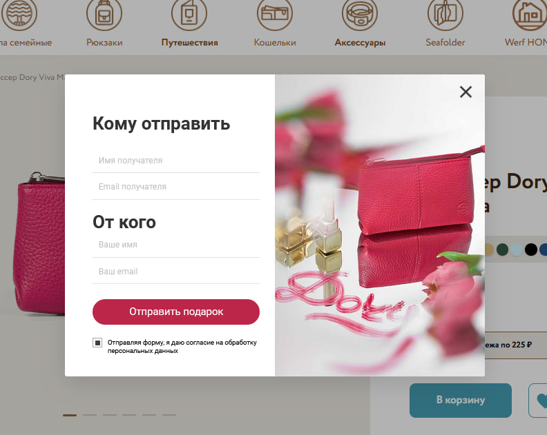 Форма для отправки письма вызывается по клику на кнопку “Отправить Dory в подарок”.