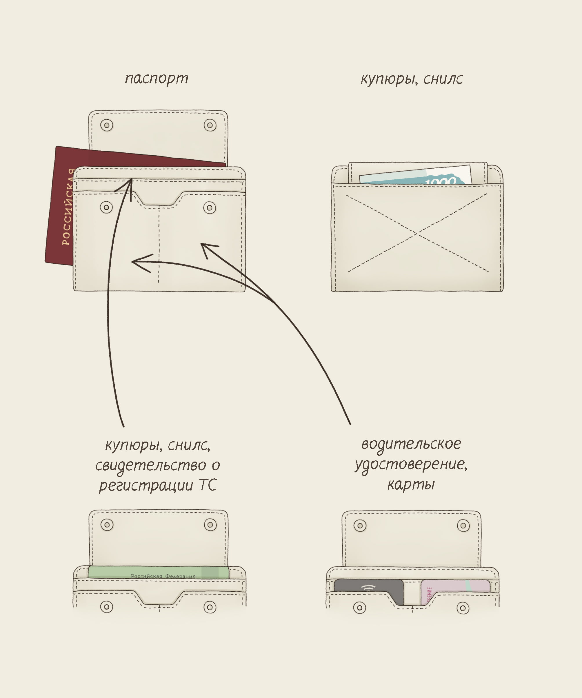 В Smart есть отделение для паспорта, 2 отсека для пластиковых карт и 2 кармана побольше для свидетельства о регистрации автомобиля, СНИЛС или купюр. Кстати, натуральную кожу при желании можно приучить к большему количеству карт, она подстраивается под ваши потребности.