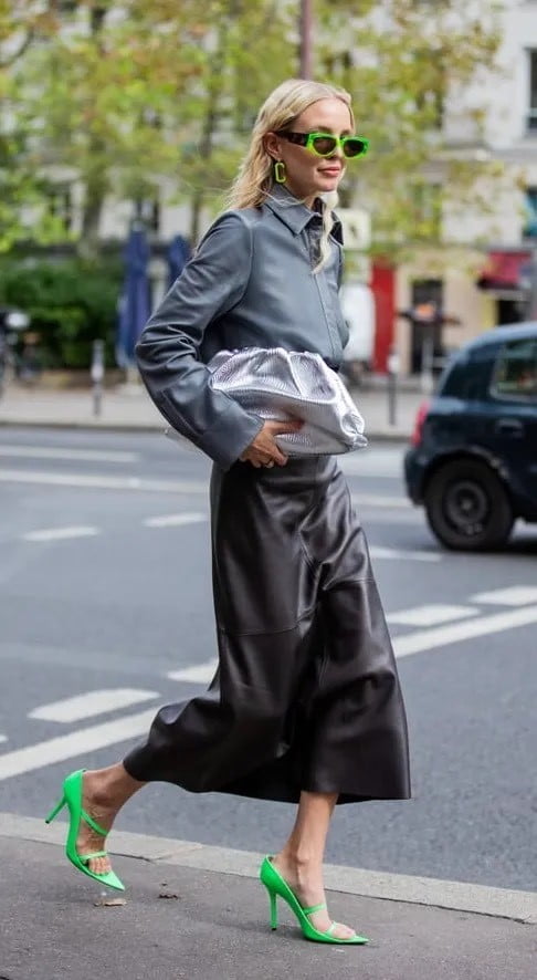 Пожалуй, если бы обладательница этого ультра-стильного образа дополнила свой объемный клатч серебряного цвет туфельками или босоножками в тон, это был бы полней провал. Ведь порой детали не просто имеют значение, а полностью меняют образ – как в лучшую, так и в худшую сторону. Ну а если вы все же хотите, чтобы элементы вашего образа имели цветовую «поддержку», что лучше добавьте нетривиальные очки или массивное колье схожего оттенка – это всегда беспроигрышный вариант.