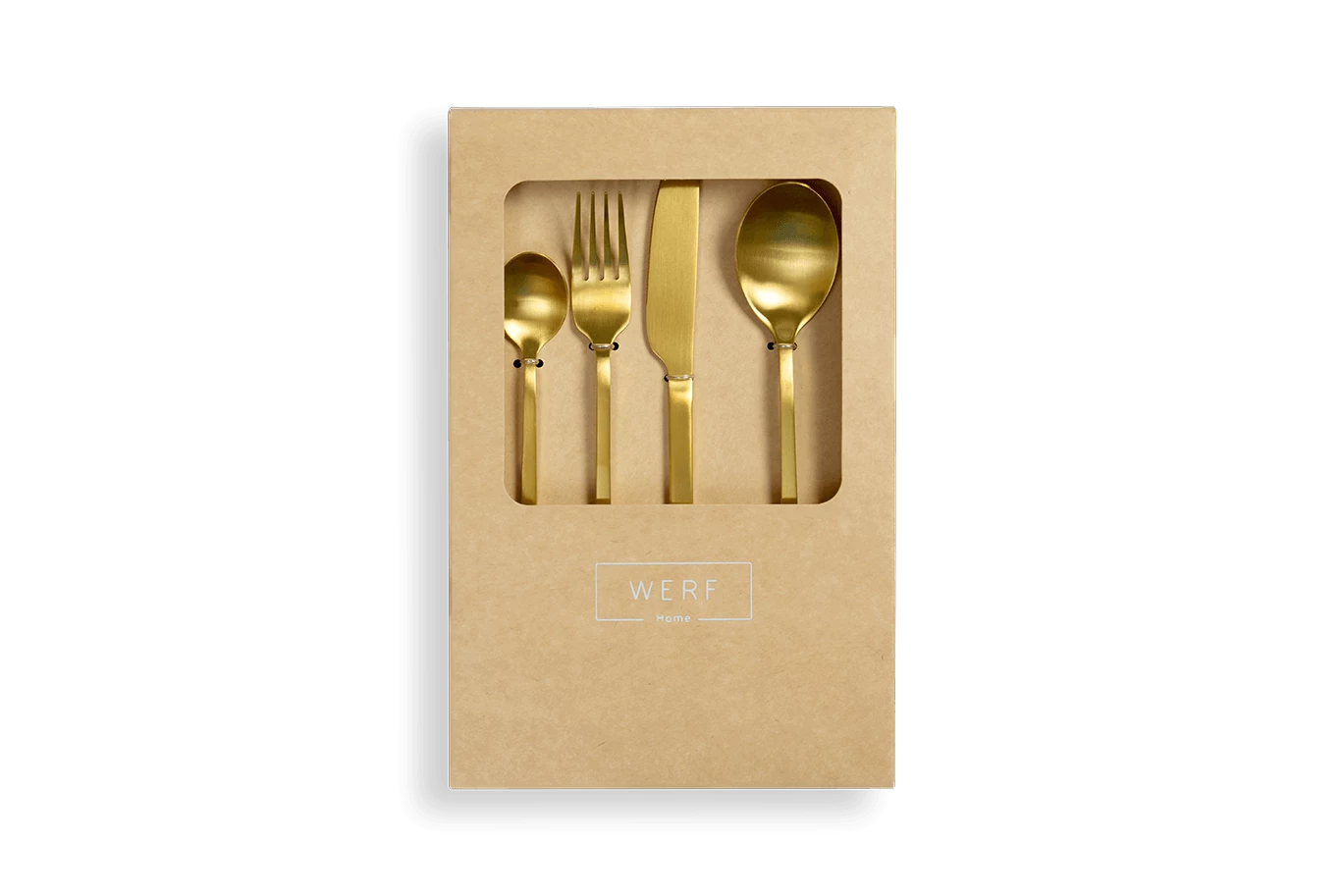 Набор столовых приборов Gold отличается лаконичностью и плавными линиями. Золотистый оттенок сочетается с любым набором посуды, а матовая полировка придаёт им особую ноту элегантности. Приборы хорошо сбалансированы и удобно лежат в руке.