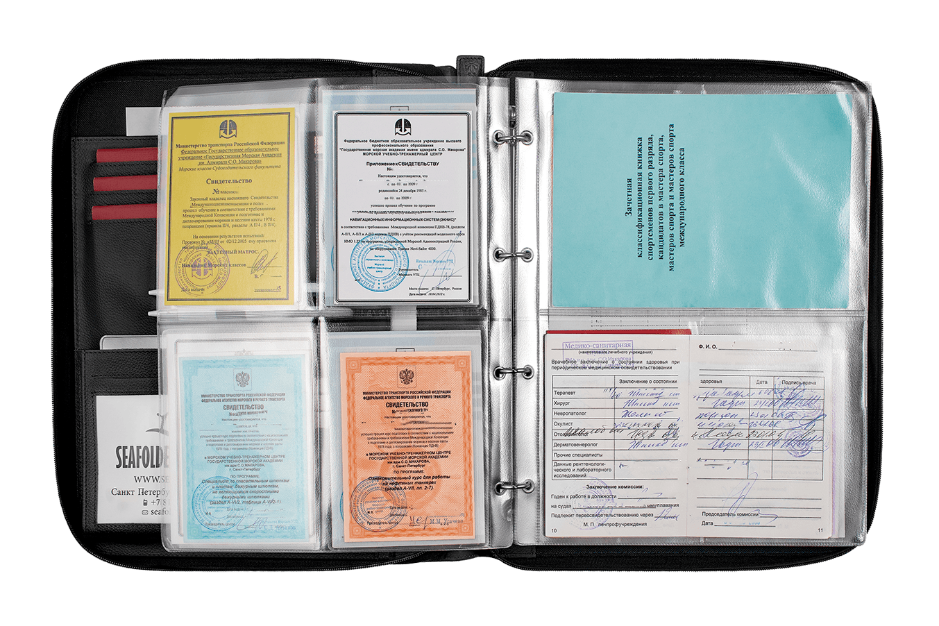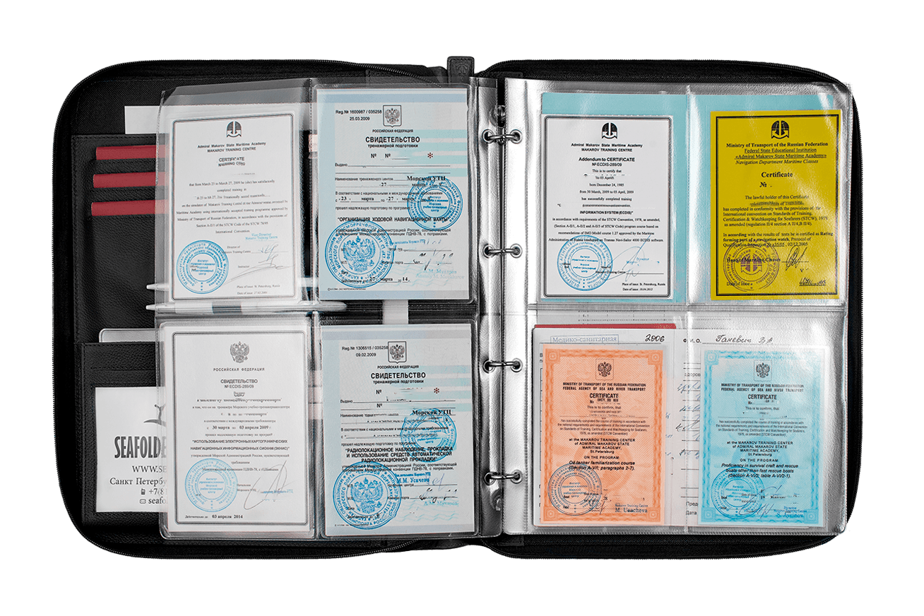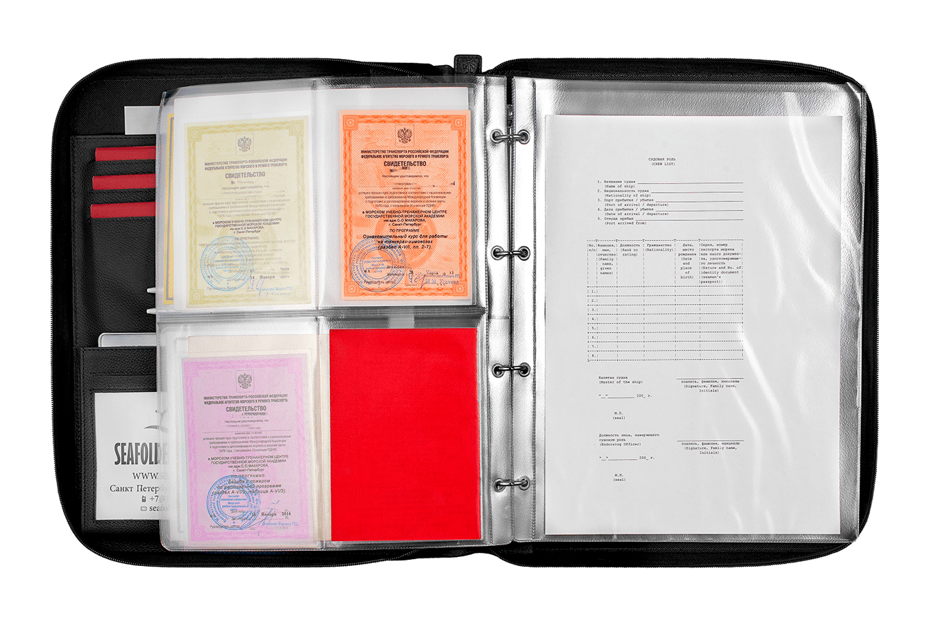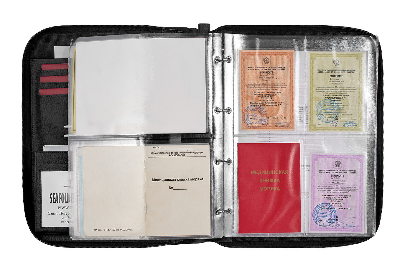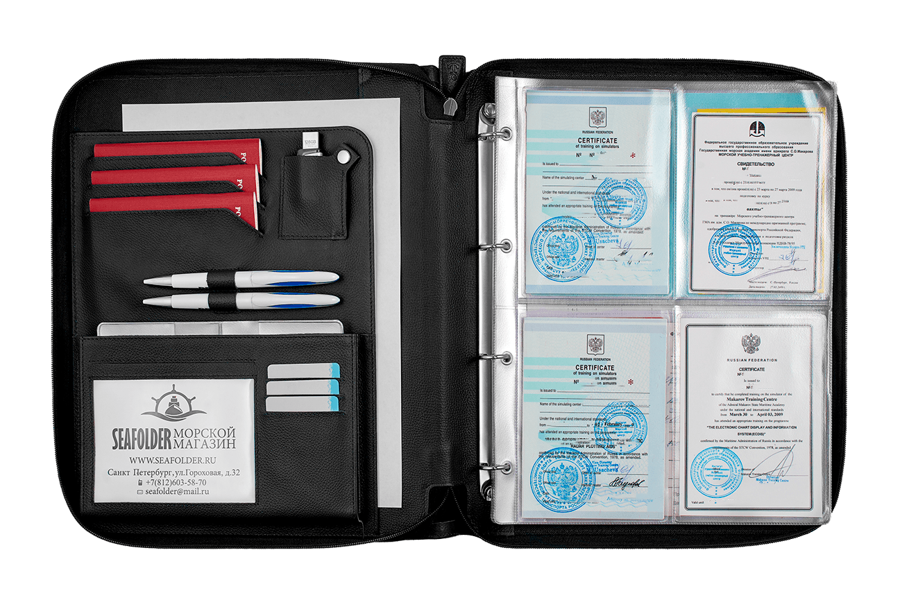 Заказал папку Seafolder Elite черный. Могу сказать, что на сегодняшний день-это лучшая система хранения для морских документов. Папка позволяет компактно хранить и транспортировать документы, экономит уйму времени при поиске нужного сертификата или диплома. Все продумано до мелочей. Видно, что к ее созданию были приложены руки людей, которые понимают нюансы морской профессии. Качество материалов также на высоте.