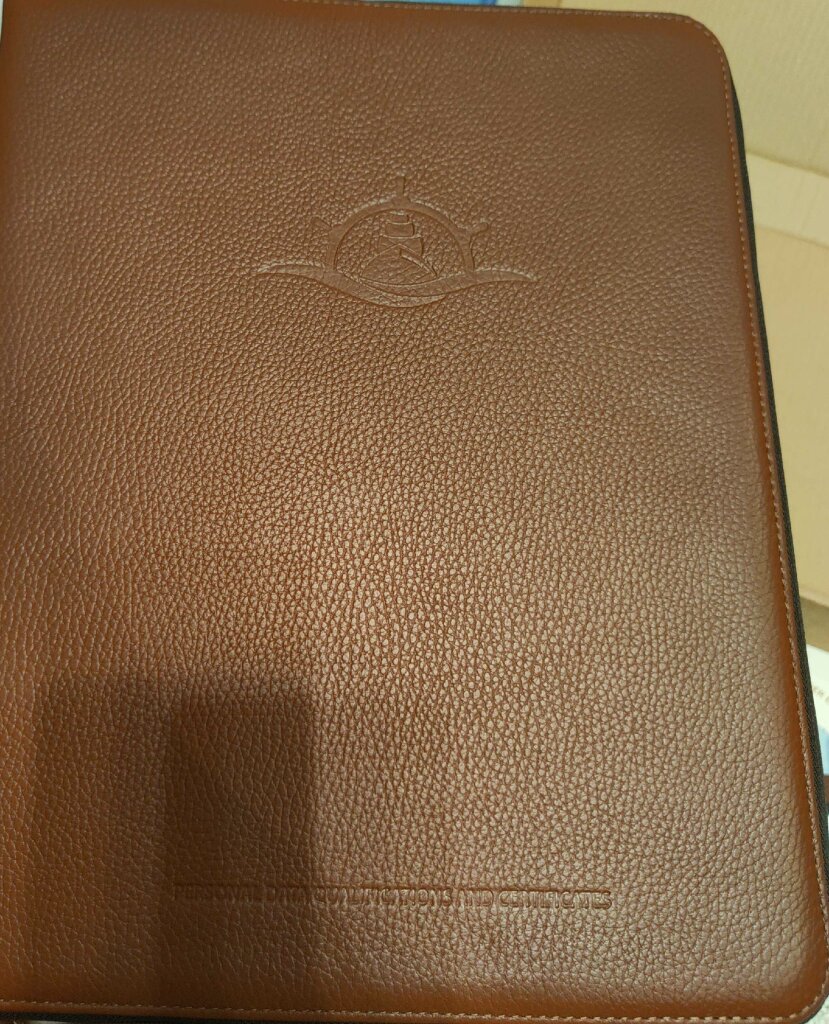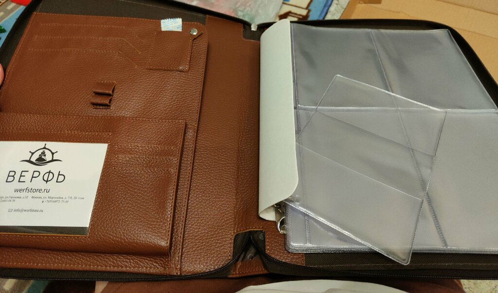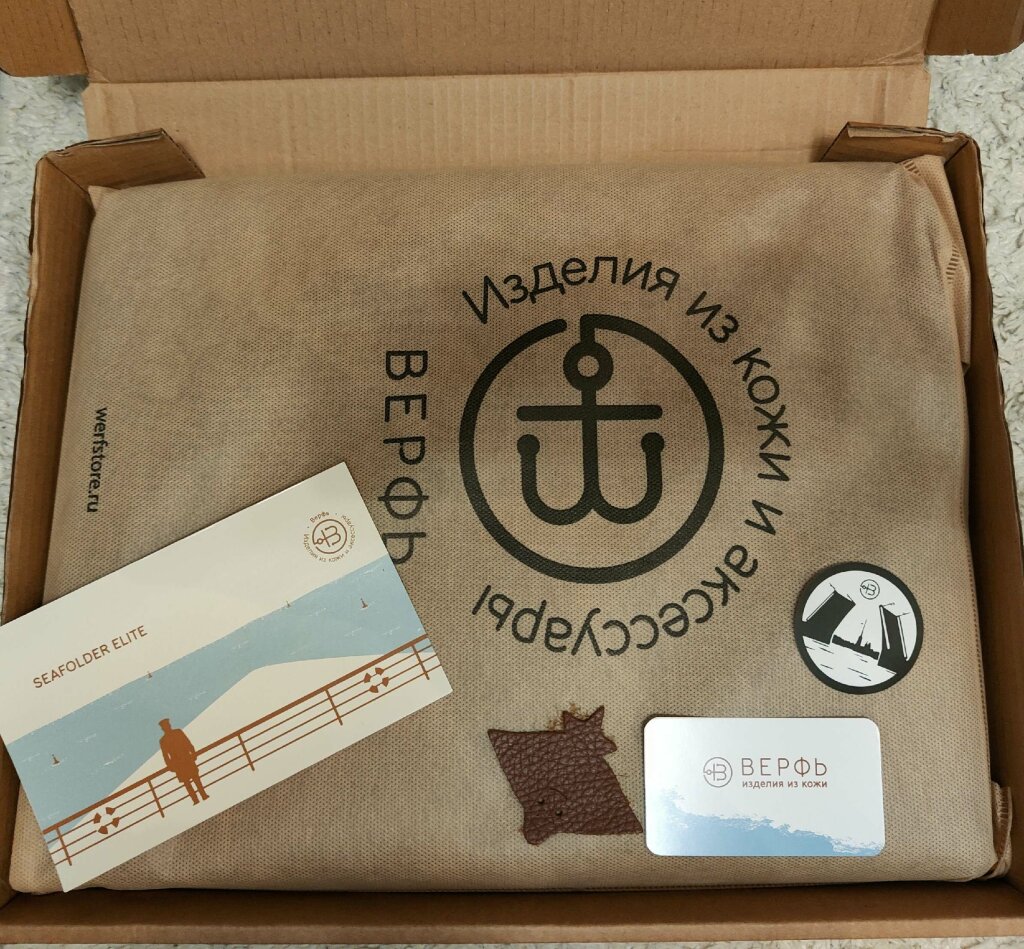 Сегодня получил свою коричневую папку! Очень быстрая доставка — был приятно удивлён! Качество папки просто супер, придраться практически не к чему! Как, собственно, и к качеству упаковки… Когда открываешь коробку с логотипом, то сразу становится понятно, что продукт изготовлен серьезной организацией, а не какой-то подпольной шарашкой))) Также был приятно удивлён наличием внутри трёх прозрачных обложек для паспортов — вроде мелочь, но приятно. Сразу же их и задействовал. К слову отсеки под паспорта мне показались слегка маловатыми — загран, гражданский и мореходная книжка влезли довольно таки с приличным натягом. Не скажу что это минус, но по мне так можно было бы их сделать чуток просторней. Ну а в общем респект и спасибо команде «Верфь»