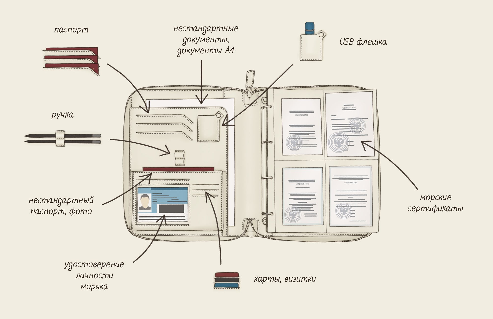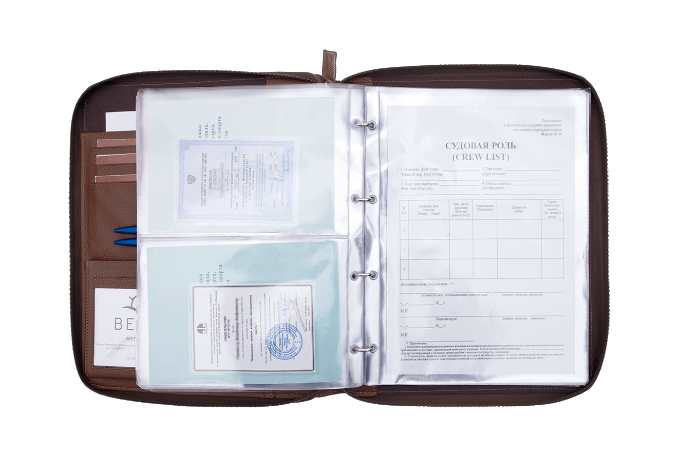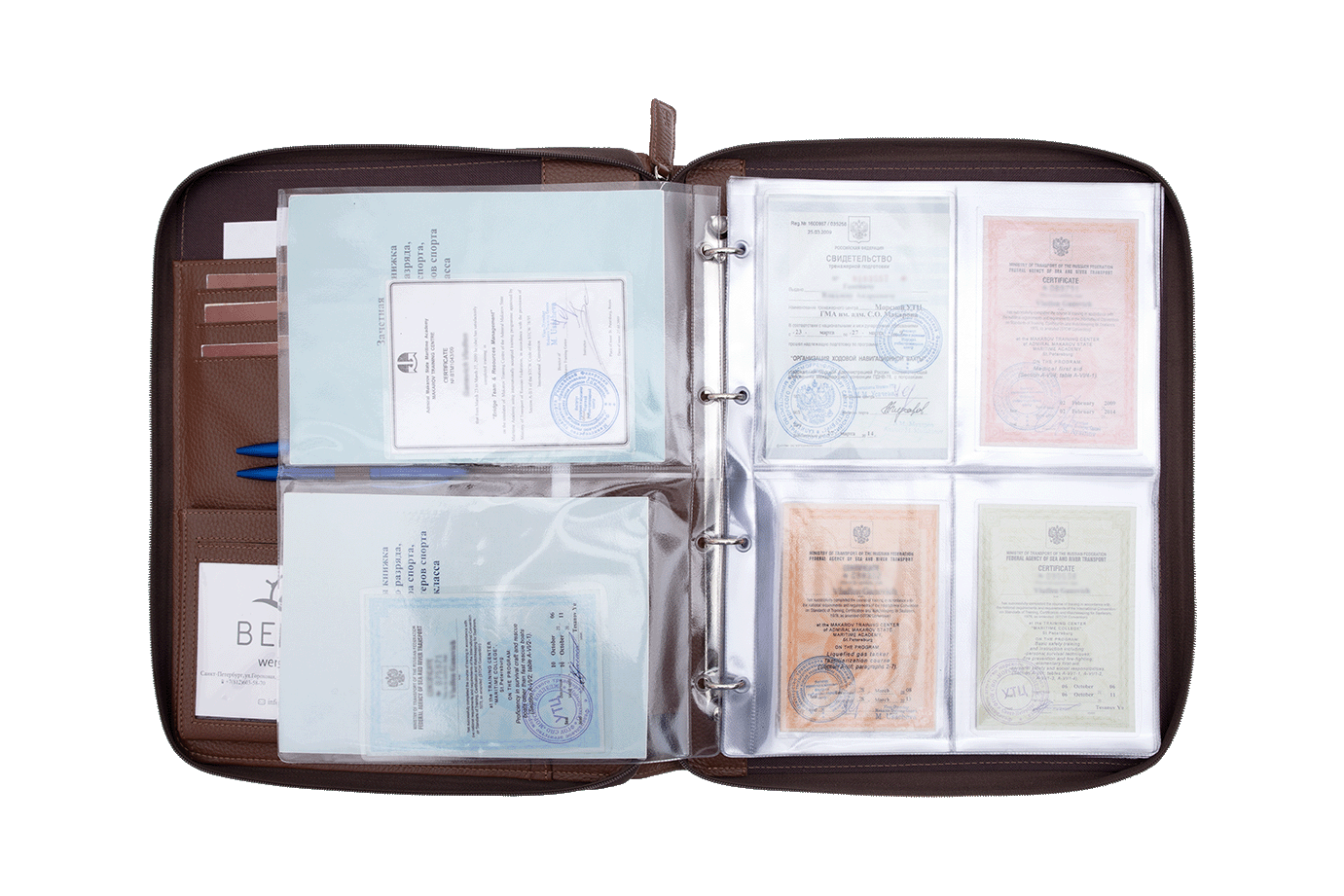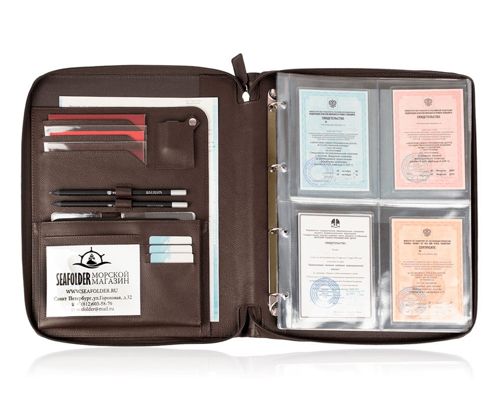 Осознание, что все документы находятся в одном надежном месте подарит спокойствие каждому моряку во время рейса. Морские папки созданы, чтобы защитить вас от путаницы в сертификатах и от суеты. Вы только посмотрите, как теперь все систематизировано! Все на своем месте. Если каждый файл и кожаный карман заполнен соответствующим документом, значит переживать не о чем: все готово для покорения морских просторов.
