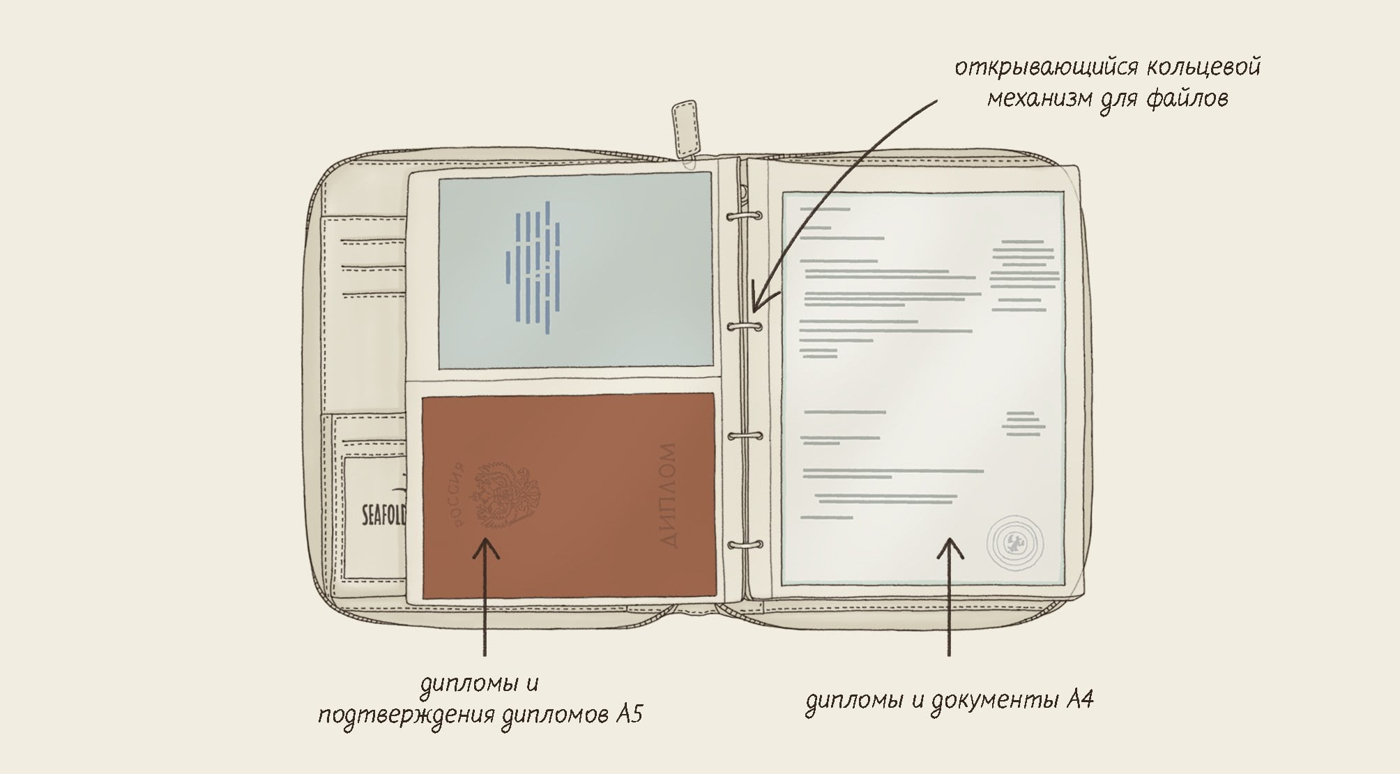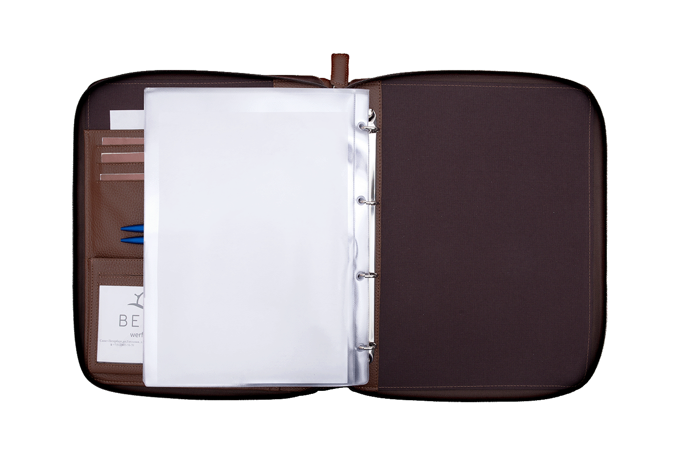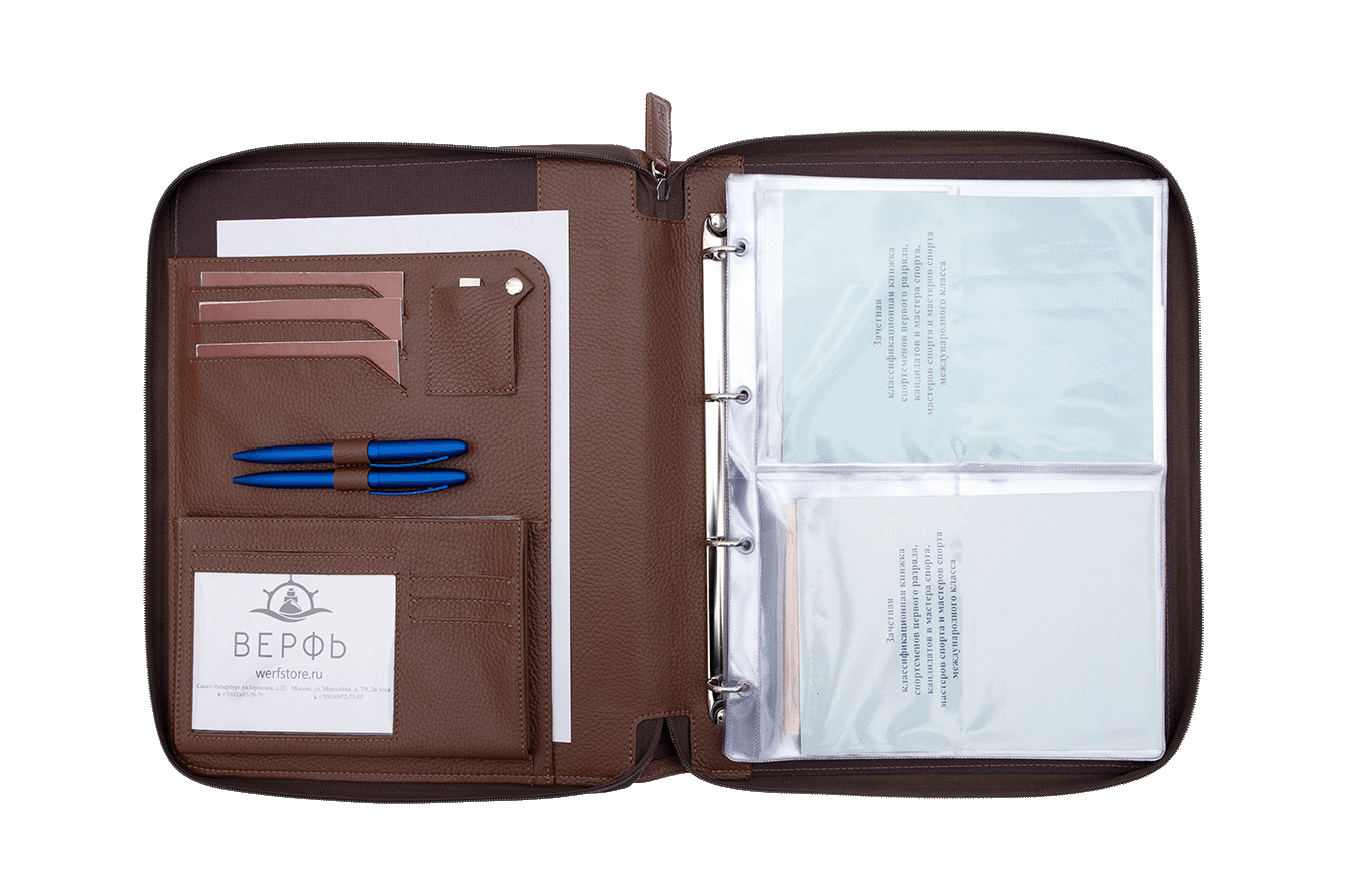 Остальные документы размещаются в плотных вкладышах из пластика. Крепятся к удобному кольцевому механизму, благодаря которому можно легко менять вкладыши местами, убирать ненужные или добавлять новые.