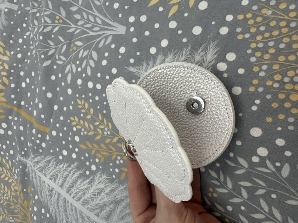 Большое спасибо за оригинальную сумочку. Она такая милая ^^;) Теперь я не ищу наушники по всей сумке, они вошли в неё как влитые. Кожа красиво блестит на солнце. Кнопка не расстегивается при носке, держится крепко. Сама ракушка сшита очень хорошо — нигде ни одной ниточки не торчит, все шовчики ровные.