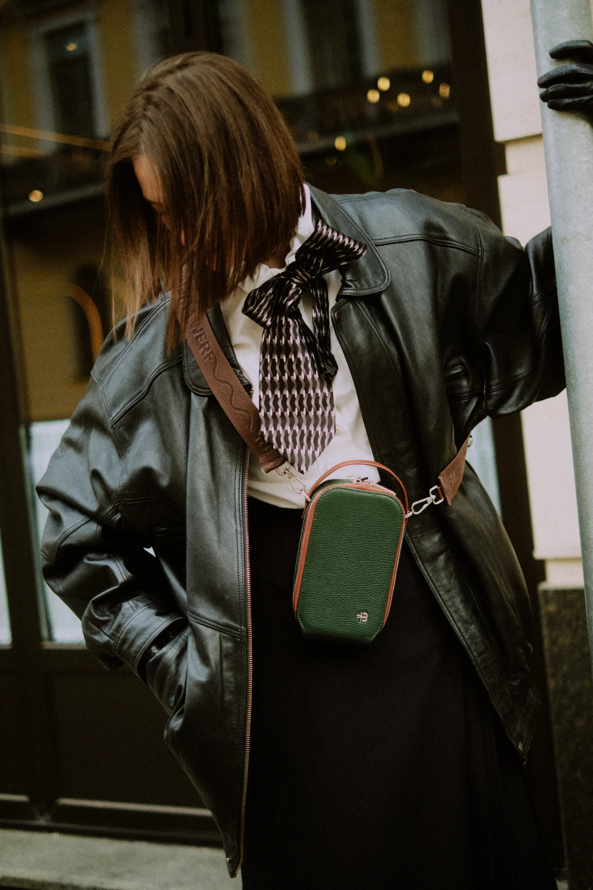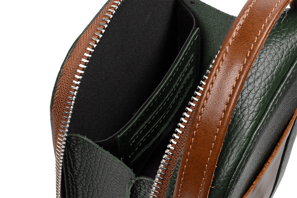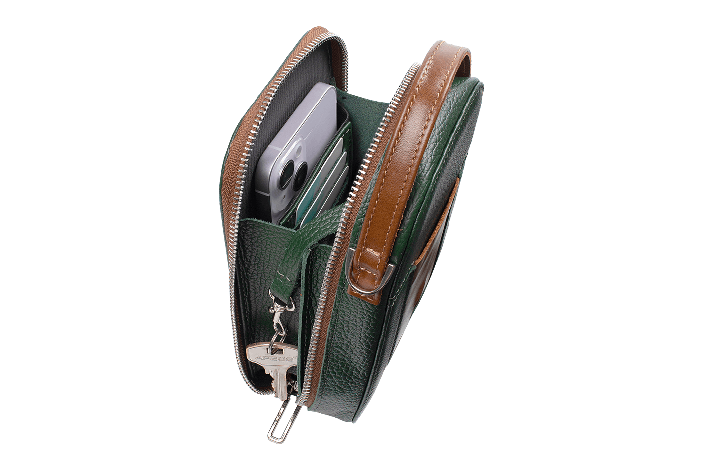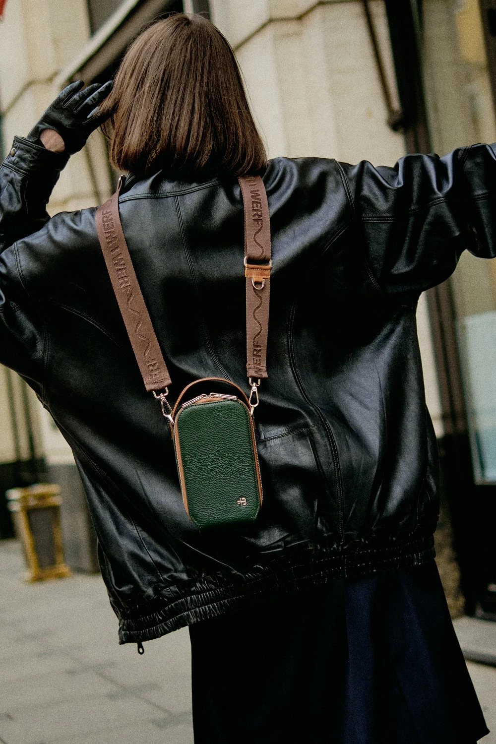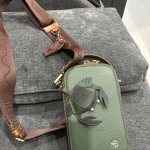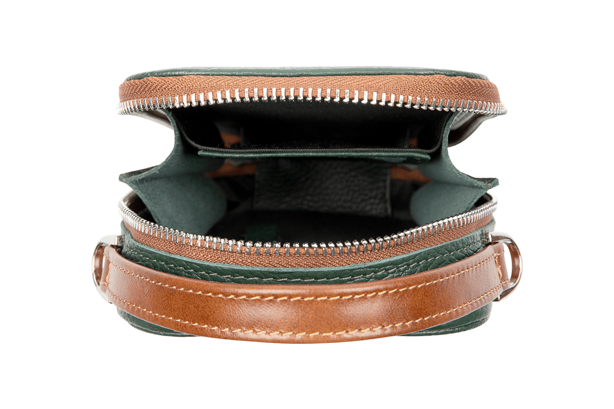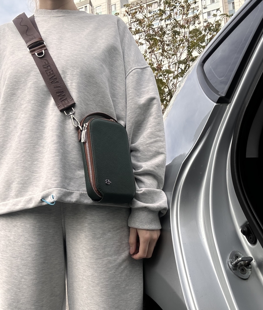 У меня эта сумочка зелёно-коричневая, долго мучилась с выбором цвета (в принципе, как всегда — ведь все красивые), остановилась именно на этом в том числе из-за ремня, потому что у остальных ремни черные, а этот в цвет. По размеру довольно удобный вариант для недалёких прогулок: у меня в сумку влезли небольшой кошелёк, ключи, проездной и паспорт в объёмной обложке. Наушники, жаль, уже не поместились.