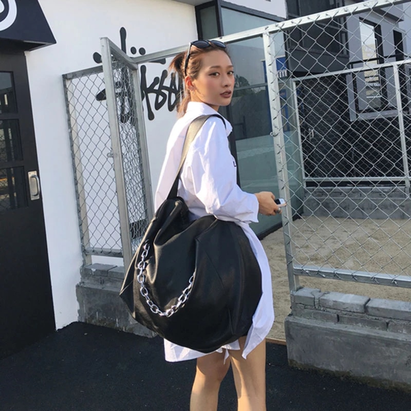 Ну а любимый вариант самых отважных модниц – это большие сумки на цепочке. Такие сумки вряд ли назовёшь очень удобными в силу своей формы и наличия длинной цепочки. Согласитесь – мягкие ручки куда комфортабельней, если ваша сумка забита всеми необходимыми вещами. Однако, смотрится такой вариант очень стильно и нетривиально.