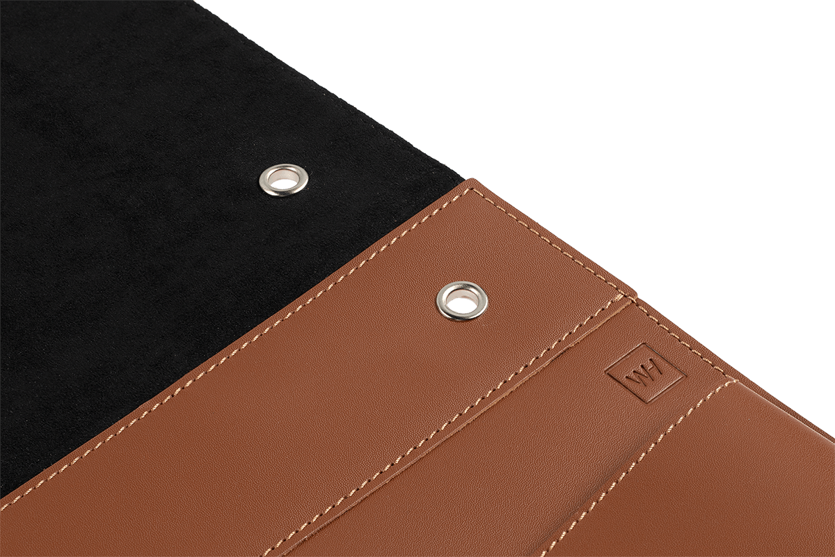 В изделии есть 3 лаконичных отделения на кобурных кнопках для вещей разных размеров, которые нужны нам каждый день. На левой стороне расположились два компактных кармана для мелочей, на правой — один большой карман для бутылки воды или вещей побольше.