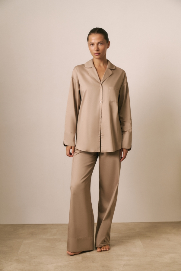 Элегантный комплект можно носить как пижаму или сочетать в повседневных образах: рубашку — с брюками или джинсами, а брюки — с лонгсливом или топом.