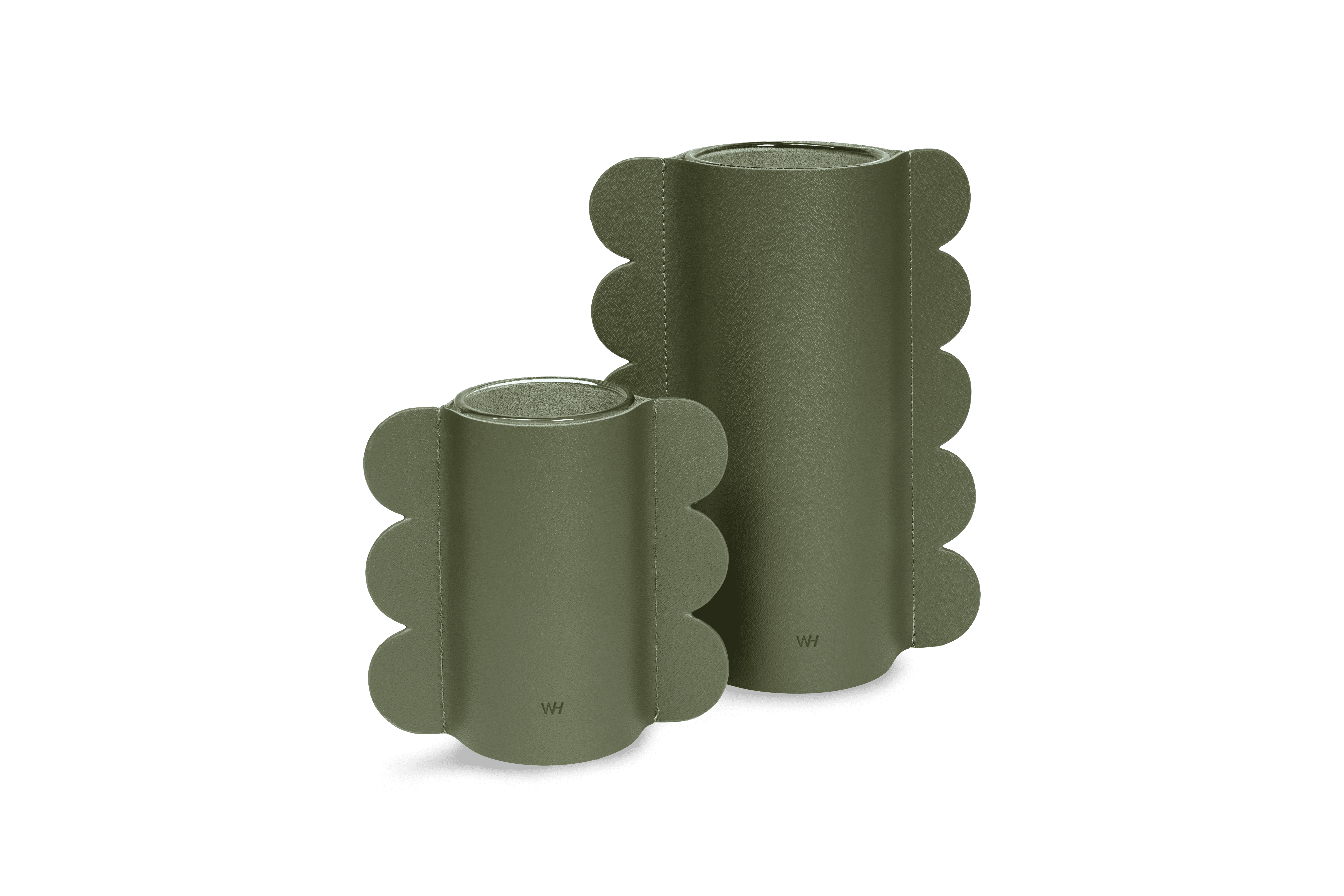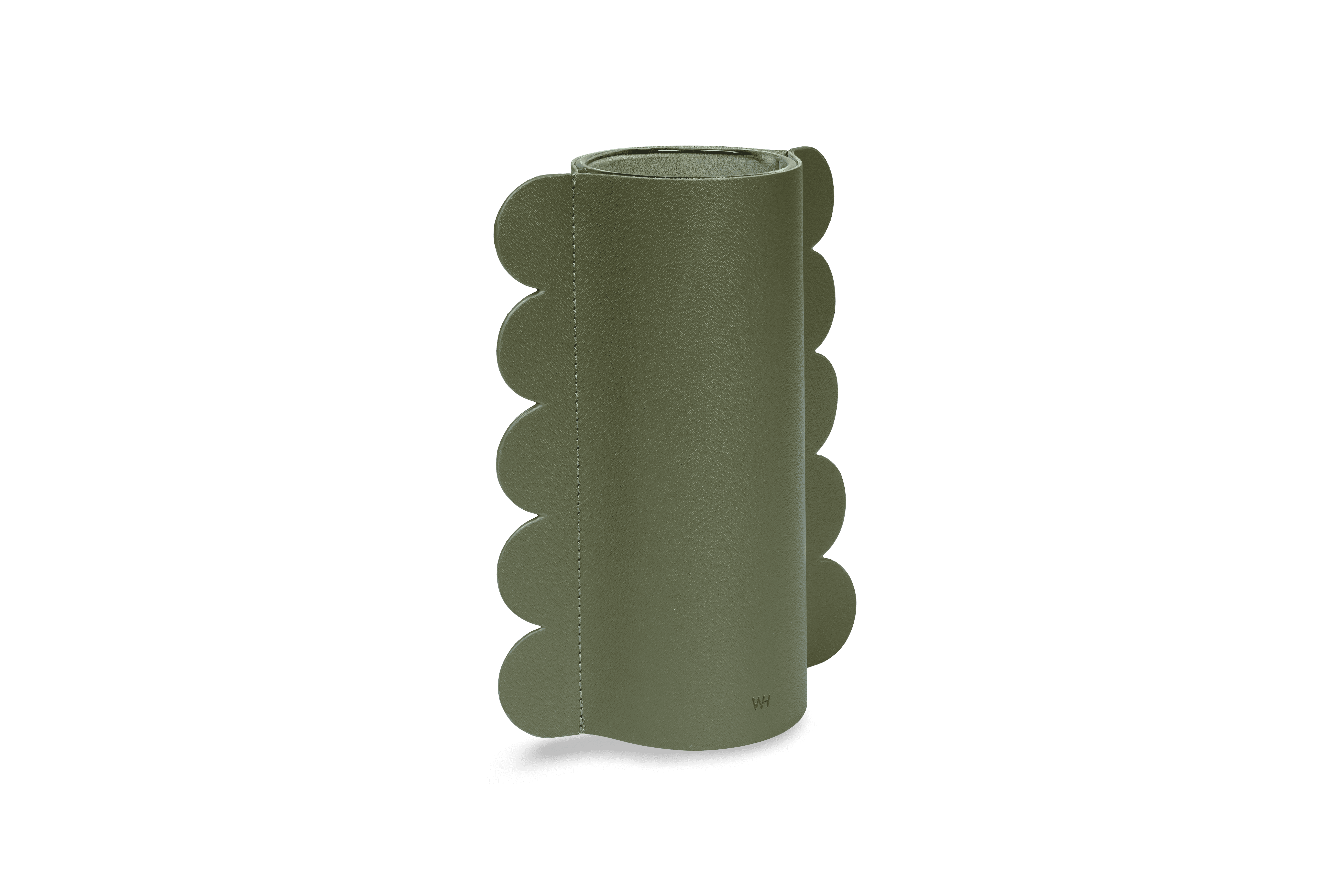 Основа вазы – боросиликатное термостойкое стекло. Покрытие - чехол из натуральной кожи с округлым лепестками на боках.