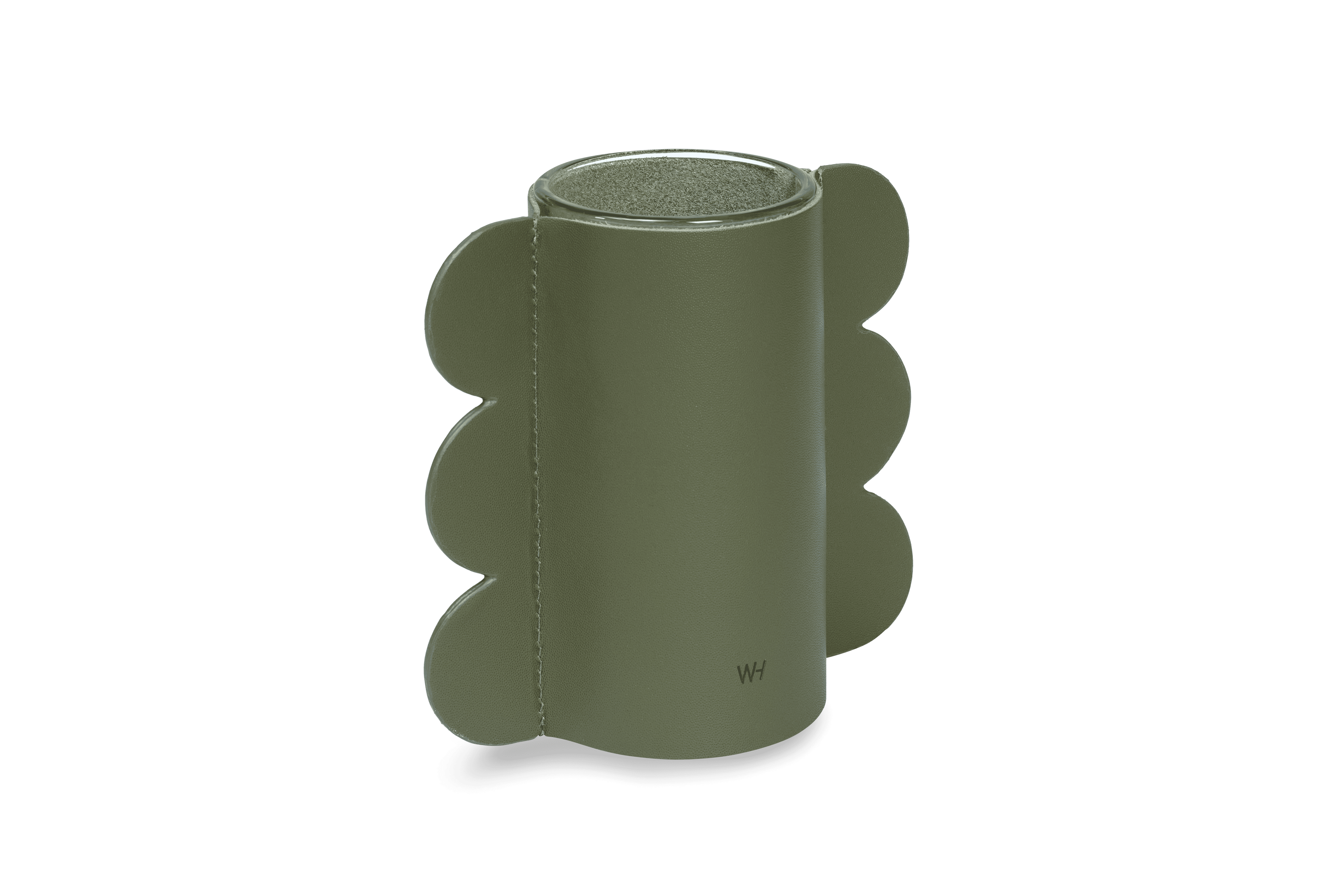 Основа вазы – боросиликатное термостойкое стекло. Покрытие - чехол из натуральной кожи с округлым лепестками на боках.
