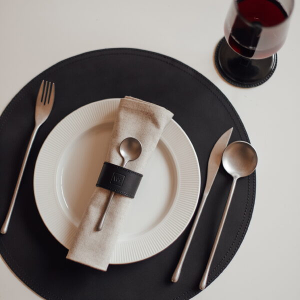 — кожаная салфетка будет хорошо смотреться как круглый подтарельник при сервировке стола;