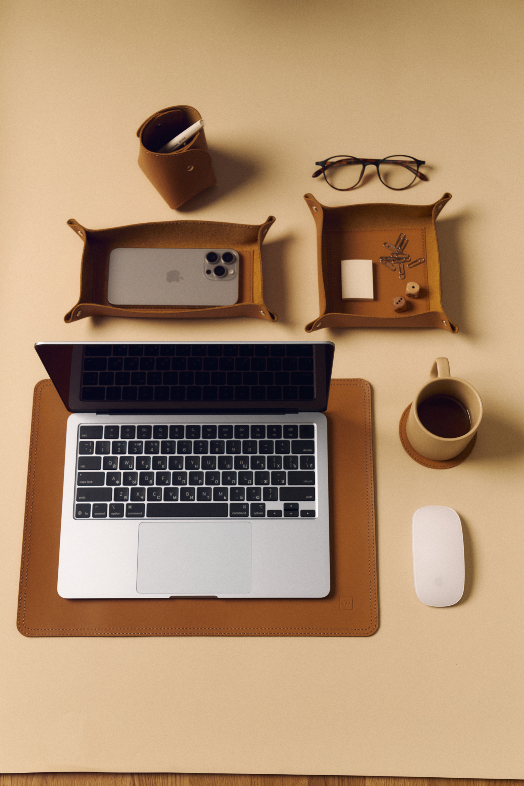 Минималистичное изделие из натуральной кожи прекрасно дополнит любой рабочий стол в офисе или дома.