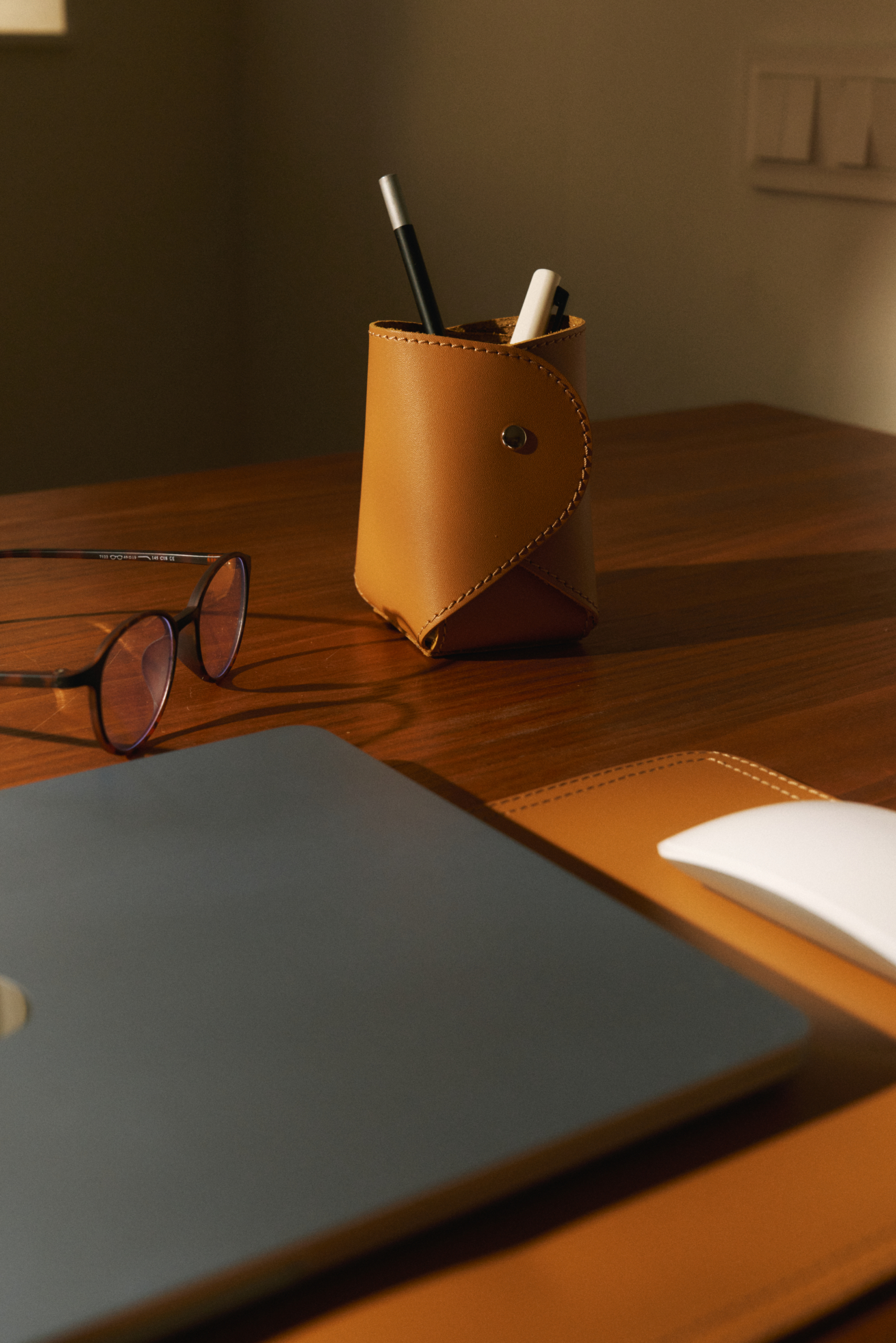Компактный аксессуар для канцелярии из натуральной кожи.