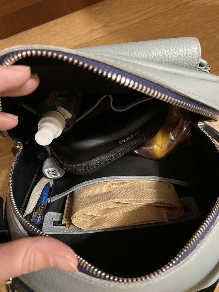 паспорт, тканевая сумка, перочинный нож, зарядный кабель, запасные наушники, резинки для волос, антисептик — в кармашках внутри