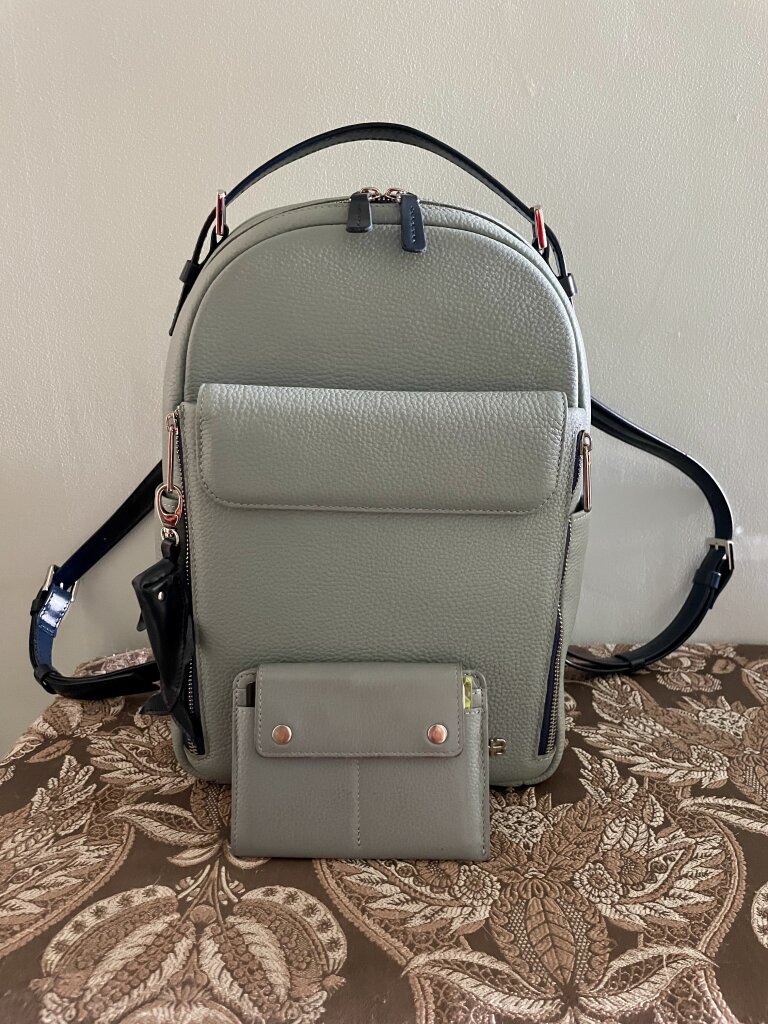 Красивый, продуманный и очень удобный рюкзак. После текстильного просто наслаждаешься порядком в вещах. Великолепный подарок себе любимой. Кстати, по фото думала, что ремешки и ручки у этой модели черные, но нет, темно-синие, безумно красиво. Кошелек брала в прошлом году, как новый.