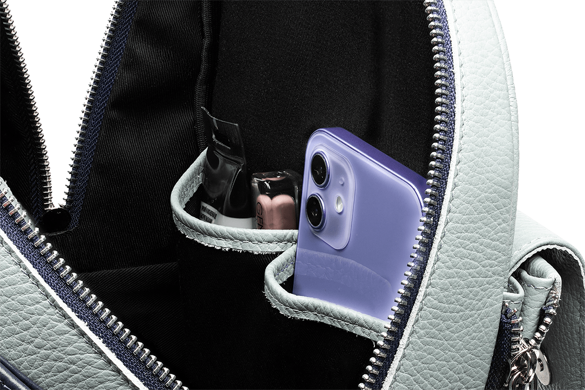 кошелек, наушники, смартфон, визитки и гигиенические принадлежности — в кармашках спереди